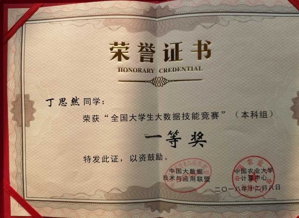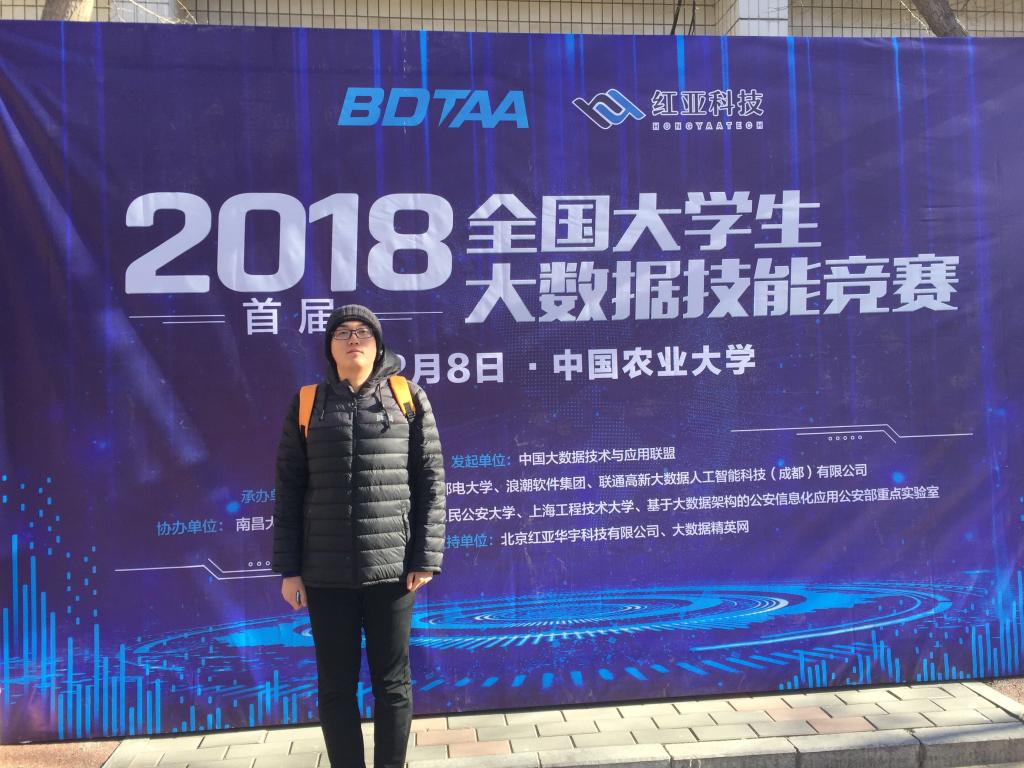 12月8日,全国大学生大数据技能竞赛在中国农业大学东校区计算中心举行。远景学院2016级轨道交通信号控制专业的丁思然同学,在大数据与软件学院基础算法创新中心、互联网创新中心总负责人霍敏霞老师的指导下,通过前期培训,参加了此次竞赛并取得了一等奖的好成绩。