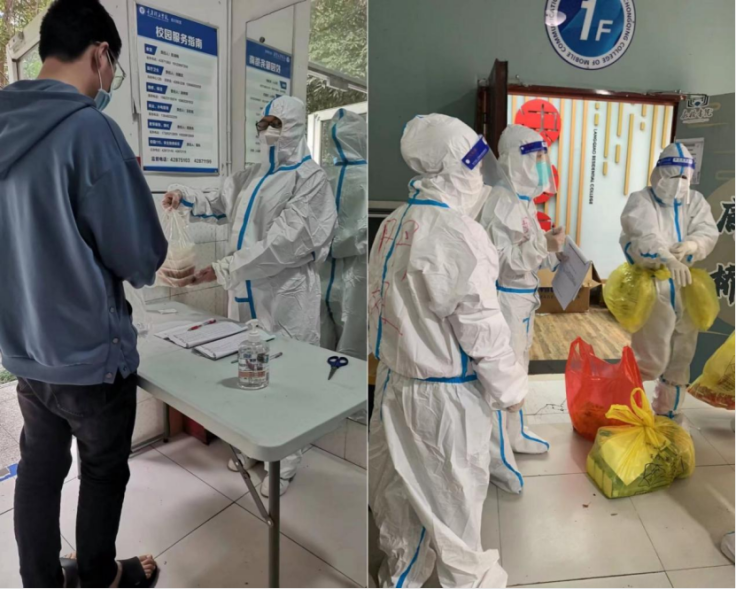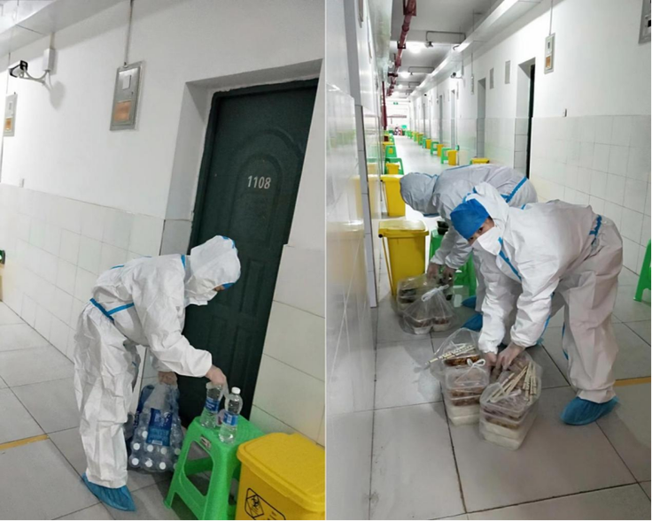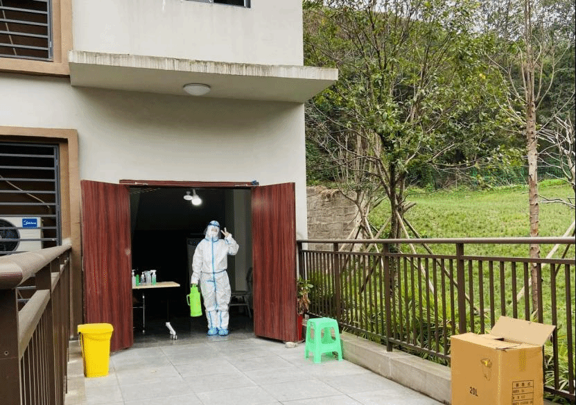 而在一线隔离区的阿姨们此时已变成了可亲可爱的“大白”,当问到她们害不害怕时,阿姨却一时难以控制自己潸然泪下:“怎么可能不害怕,可是我们能不管这些同学吗?这些学生,他们也不想生病,他们也不想被隔离,现在的情况不能换班,我们没有退路,必须顶上……”阿姨们为同学登记信息、测温记录、送餐、消毒……汗水在密不透风的防护服下干了又湿,哪怕受凉生病,却依然坚守在岗位上,未曾倒下。