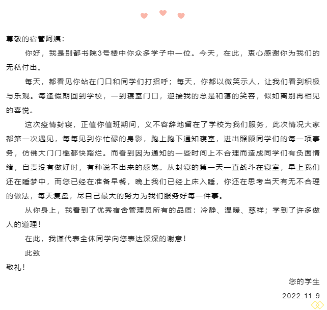 以下是一名匿名的同学写给宿管阿姨的一封信