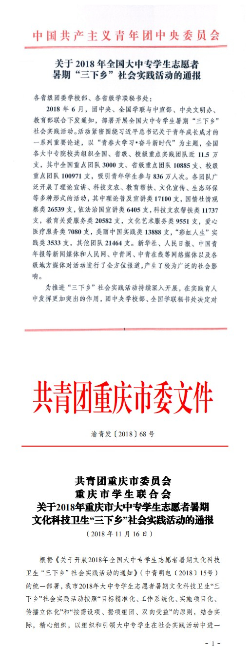 近日,共青团中央、全国学联下发《关于2018年全国大中专学生志愿者暑期“三下乡”社会实践活动的通报》,共青团重庆市委、重庆市学联下发《关于2018年重庆市大中专学生志愿者暑期文化科技卫生“三下乡”社会实践活动的通报》。