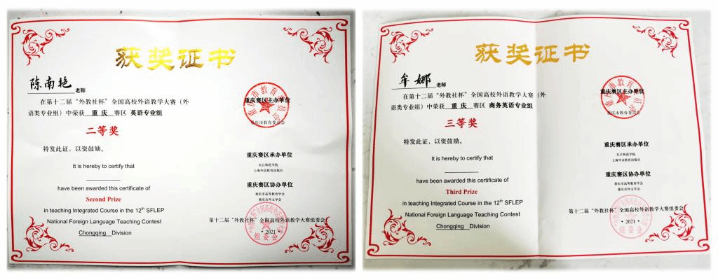 今年五月,外国语学院举行了校内规模最大的一次教学技能大赛,陈南艳、牟娜老师排名领先,分别代表我校参加本届“外教社杯”全国外语教学大赛重庆赛区英语专业组和商务英语组的比赛。在全市二十多所参赛院校的竞争中突围复赛,在决赛中,陈南艳获英语专业组二等奖,牟娜获商务英语组三等奖。