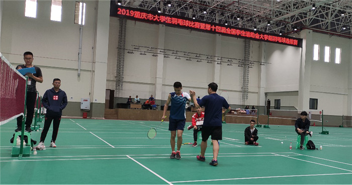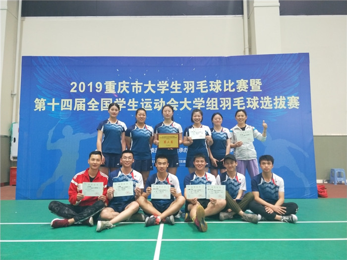 2019年重庆市大学生羽毛球比赛暨第十四届全国学生运动会大学组羽毛球选拔赛5月27日在重庆交通大学江津校区拉开序幕。竞技体育中心主任张永刚老师担任领队,李红娟老师、王伟伟老师担任教练,我校参赛运动员经过激烈的比赛竞争,在比赛中荣获甲组团体总分第三的好成绩,其中孔德辰荣获甲组男子单打冠军;孔德辰、何勇荣获甲组男子双打冠军;何勇、余小娜荣获甲组男女混合双打第五名,比赛成绩取得历史性突破。