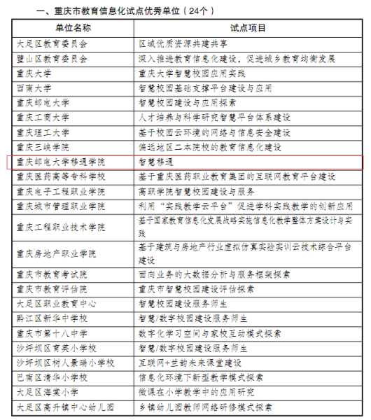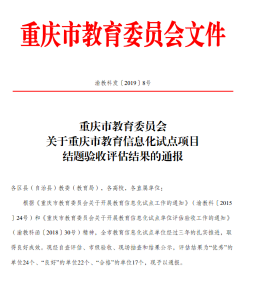 根据《重庆市教育委员会关于开展教育信息化试点工作的通知》(渝教科〔2015〕24号)和《重庆市教育委员会关于开展教育信息化试点单位评估验收工作的通知》(渝教科函〔2018〕30号)精神,我校于2015年申报“智慧移通”信息化项目,并通过自查评估、市级验收、现场抽查等环节。近日,重庆市教育委员会公布了评选结果,我校成功被评为重庆市教育信息化试点优秀单位。