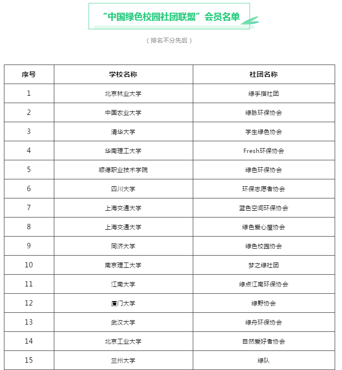 中国绿色校园社团联盟(CGCAN)于2016年11月正式成立,是教育部高校建设发展规划中心下设的相关组建单位。致力于打造绿色社团合作交流平台、绿色创新创业指导平台、绿色学生领袖培养基地和绿色校园建设参与基地。在我校团委、学生社团联合会的指导下,第三届重庆移通学院绿色社团联盟一直积极与中国绿色校园社团联盟建立切实联系,在2020年12月再一次向中国绿色校园社团联盟秘书处提交相关材料申请。