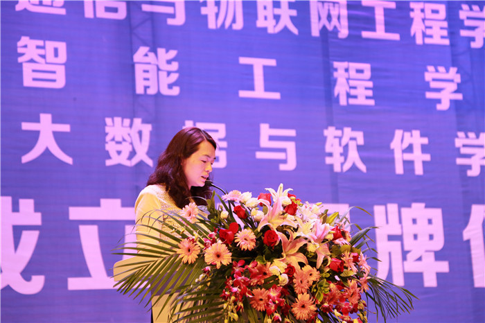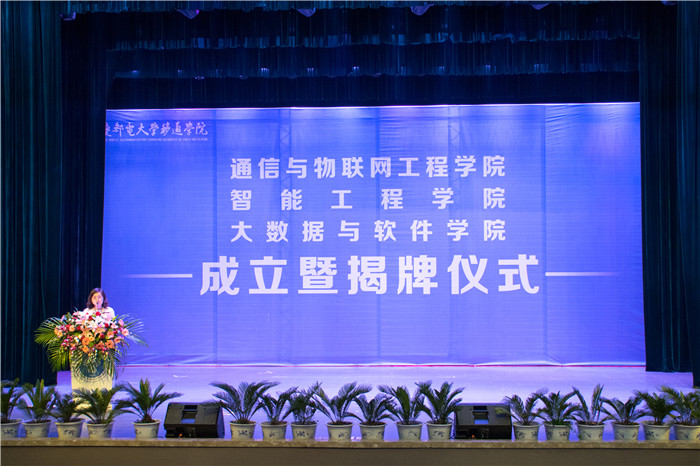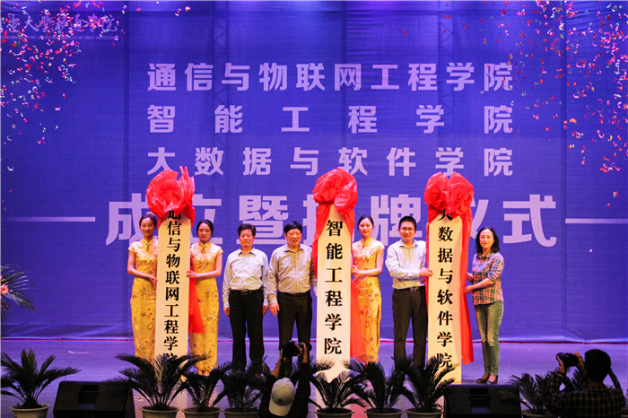 副院长王征宣读了成立和任免文件:“撤销通信与信息工程系,成立通信与物联网工程学院;撤销自动化系,成立智能工程学院;撤销计算机科学系,成立大数据与软件学院;撤销教学督导办公室,成立教学督导与质量评价中心。”翔美教育CEO李茂军女士与通信与物联网工程学院院长毛期俭、智能工程学院院长汪纪锋、大数据与软件学院院长郑先锋共同为三个学院揭牌。全体校领导、各院系部各处室负责人、教师代表和学生代表近千人共同见证了这个载入校史的光荣时刻。