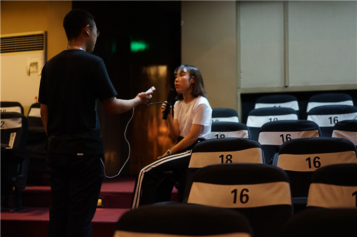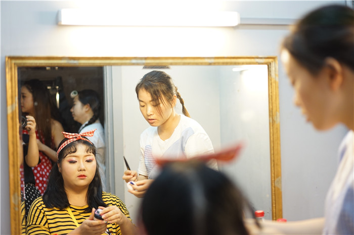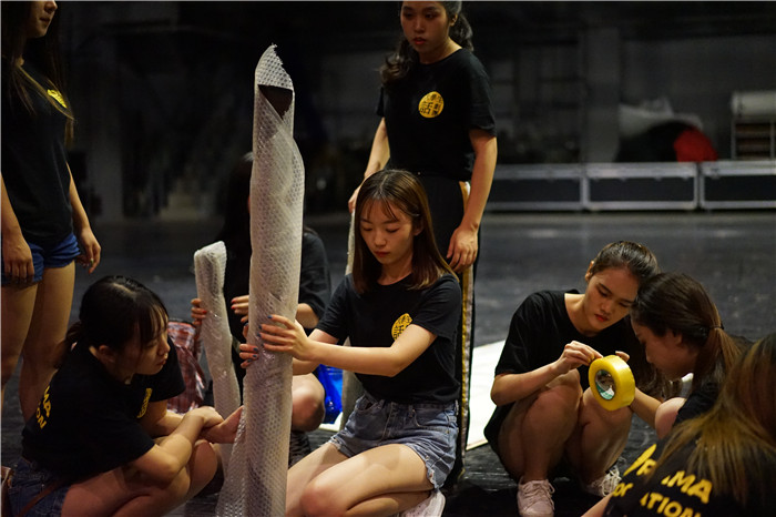 首演这一天,编剧/导演申琴老师、舞美设计李蒙老师、服化设计李平老师带领同学们早上十点进入剧场进行最后的准备工作:从熟悉道具上下、化妆、摆放人形kt板、宣传册......直到下午六点半全部就位,等待观众们的来临,七点半《话剧团的心跳》首次公演与大家见面。