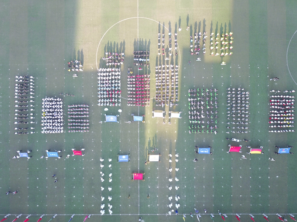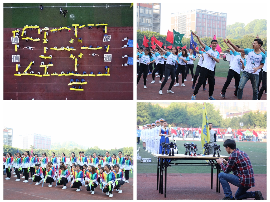 伴随着激昂澎湃的《运动员进行曲》,本届运动会拉开序幕。国旗班、仪仗队、红旗队率先依次进场,阔步走过主席台接受领导和师生的检阅,矫健的步伐展现出我校学生的朝气蓬勃和飒爽英姿。9支院系运动员方阵和6支教职工运动员方阵,身着整齐划一的服装,迈着坚定有力的步伐,口喊高亢嘹亮的口号一一走过主席台。其中,外语系方阵带来的英格兰舞蹈和德国民族舞蹈、通信与信息工程系方阵带来的 “电路图”街舞、自动化系方阵带来的机器人表演向我们展示了院系的独特风采。