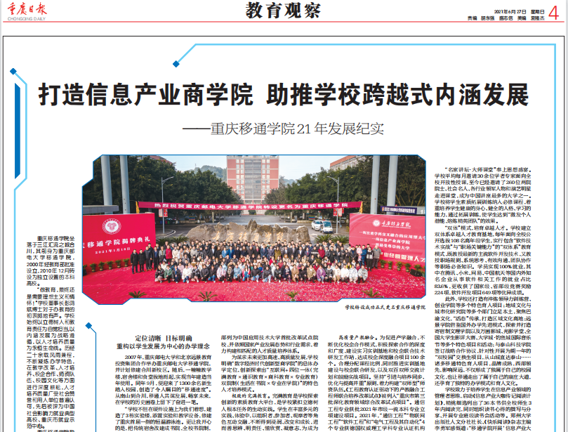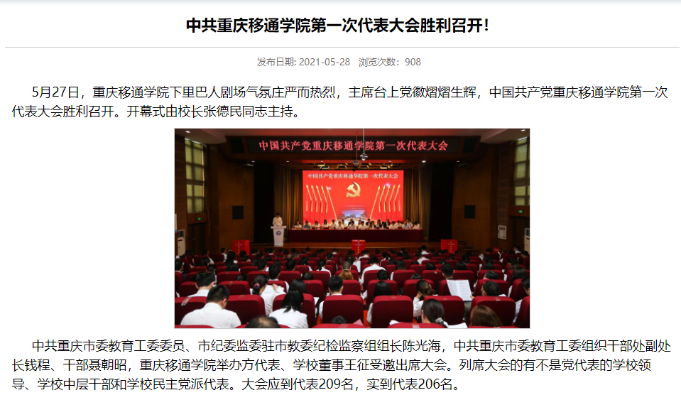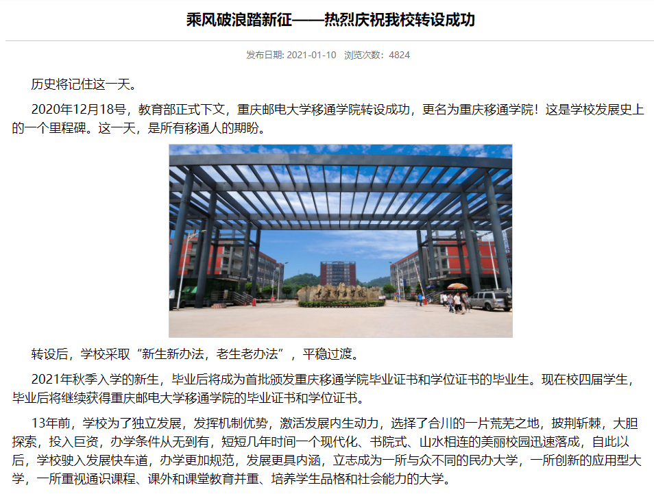 2020年12月,学校成功转设。2021年,学校正式在全校开展“信息产业大咖传记阅读计划”,召开中国共产党重庆移通学院第一次代表大会,认真开展党史学习教育,重庆日报多次报道学校发展历程、教学育人成果,学校被ABC RANK咨询机构评为2021年中国民办大学前三,学校綦江校区投入建设并正式启用,在全校如火如荼推行全生异科导师制……