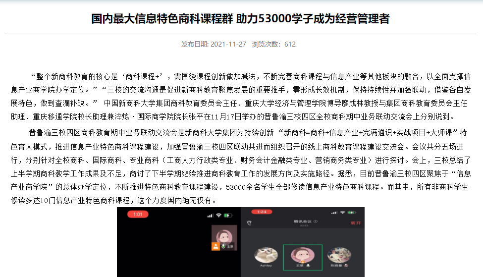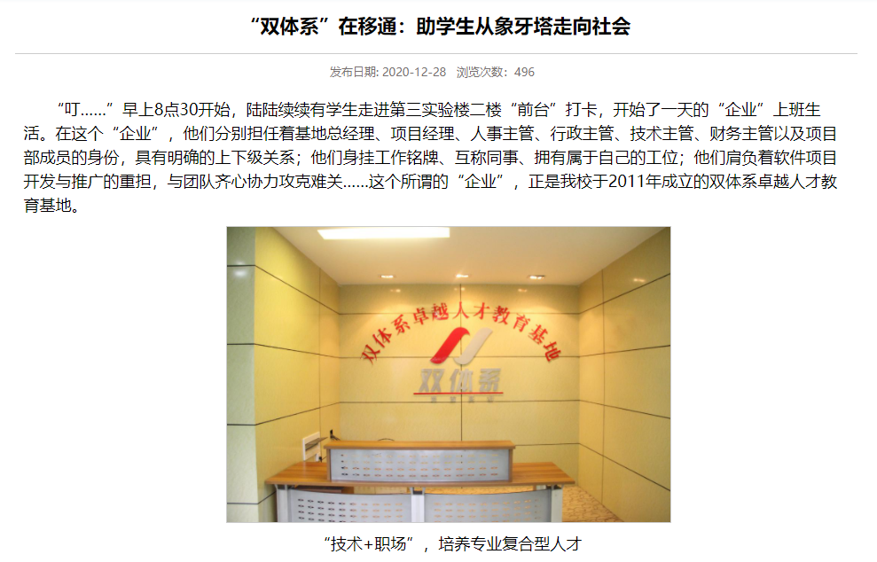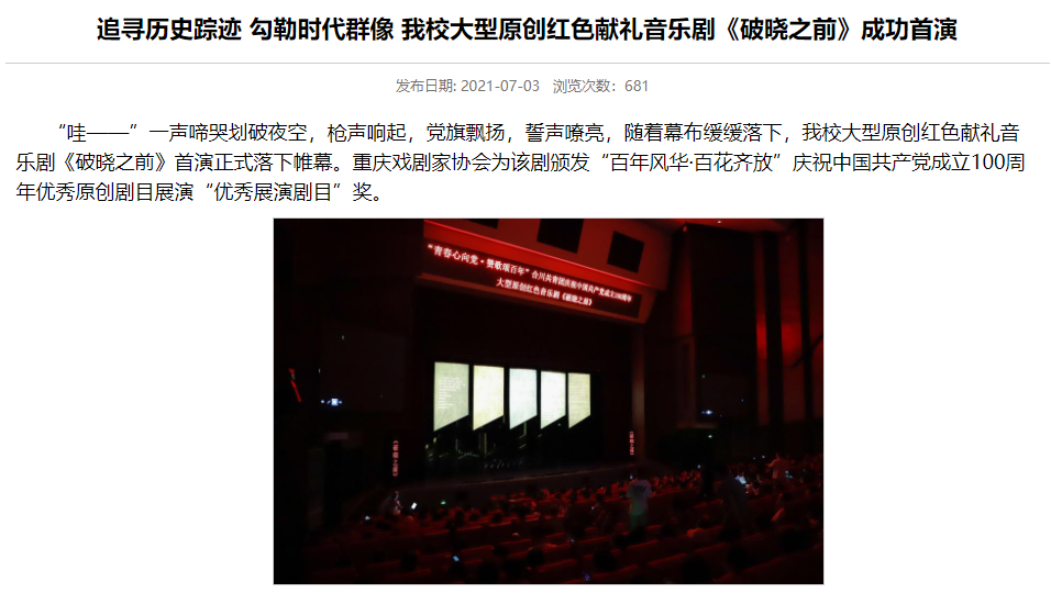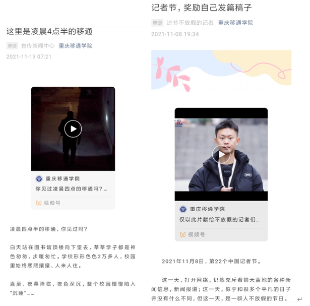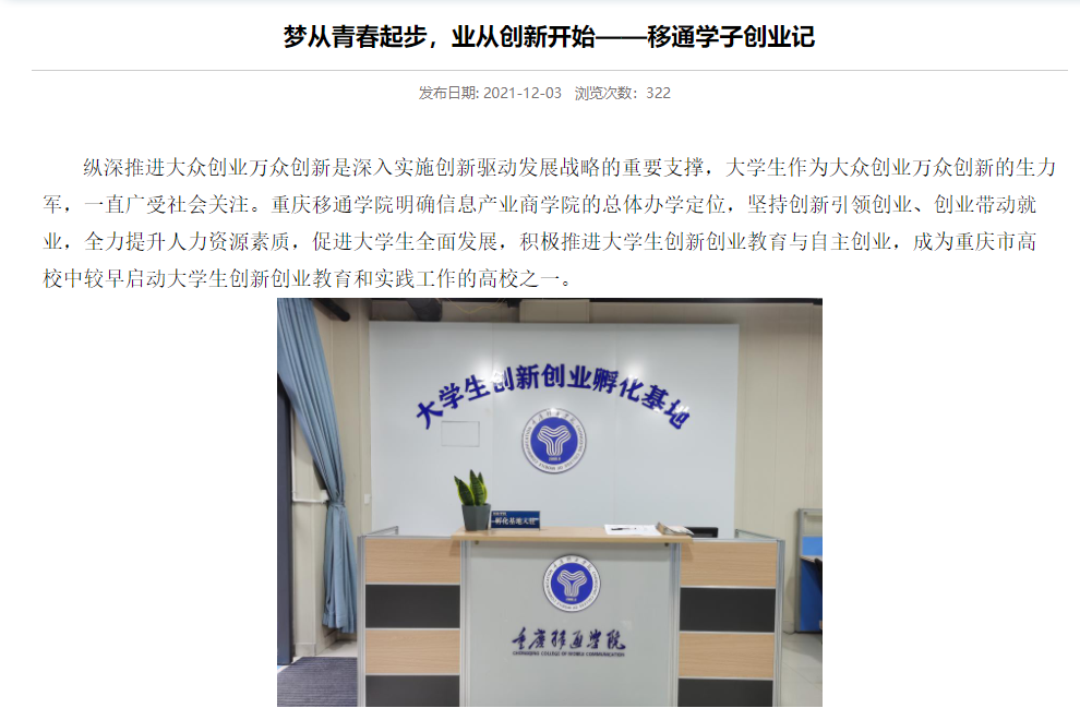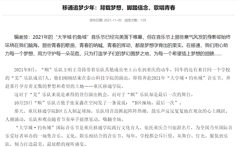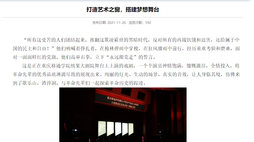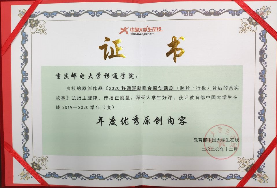 2020年11月2日,《不忘初心,勇敢追梦——2020我校迎新晚会原创话剧<照片·行板>背后的真实故事》正式登上重庆移通学院官网,成为了《移通故事》栏目的第一稿,这篇稿件荣获2020年度中国大学生在线“年度优秀内容奖”。