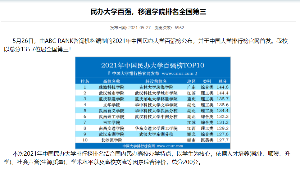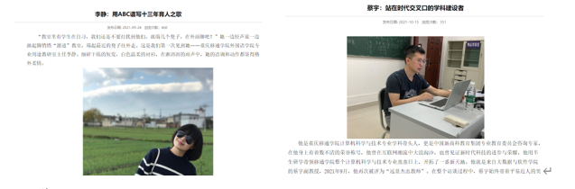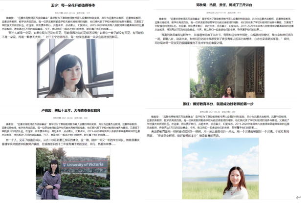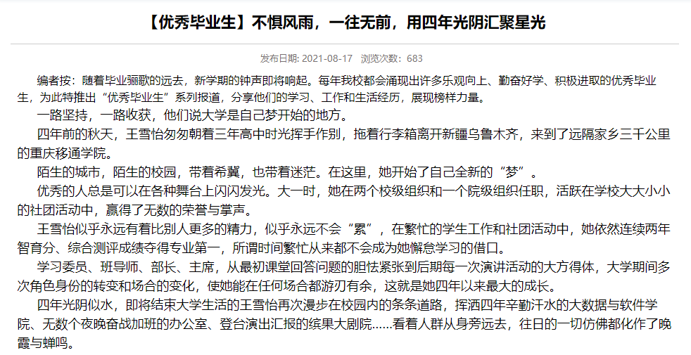 截至目前,《移通故事》栏目已在官网单独设置【移通故事】专栏,在官微设置#通哥专访记#,并陆续开辟【优秀教师】【优秀毕业生】【大咖·书评】【移通·校友汇】【移通信箱】等多个子栏目系列报道,采访校内外师生上百人,发表文章75篇,共计15万+字,文章相继在中青网、中国教育在线、中国大学生在线、重庆日报、重庆市共青团、重庆晨报、今日头条、搜狐新闻、腾讯新闻、腾讯校园等外媒平台发表,浏览量累计90万+,部分文章反响强烈,获得校内外师生一致好评。