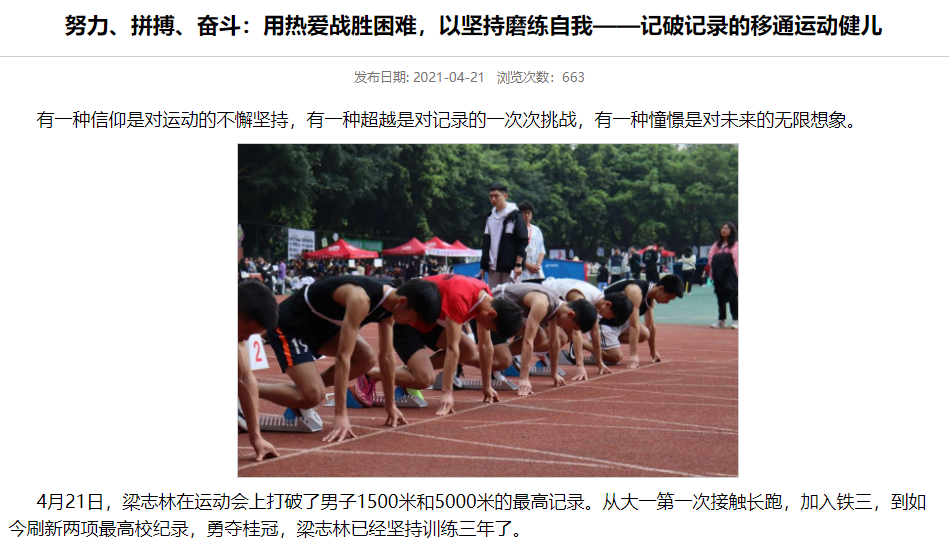 《移通故事》转变报道视角,将目光转向“盲点”,以校园生活为抓手,聚焦移通人物,重点挖掘校园特色教师、学生群体,以物载人,持续关注校园文化建设,通过不断走访挖掘校内人物故事,撰写深度采访报道,做好“硬话软说”,一个个鲜活的“移通人” 跃然纸上,潜移默化地展现移通师生形象,将移通的精神脉络连接起来,传达到每一位师生心中,传播属于“移通人”的移通精神。