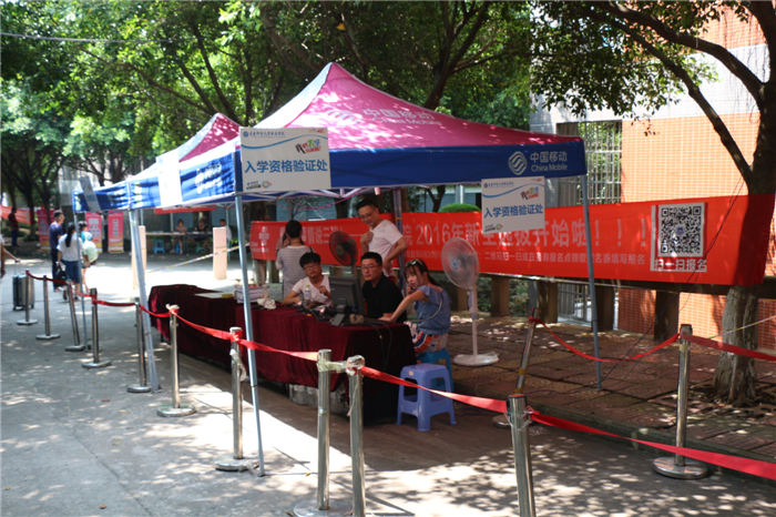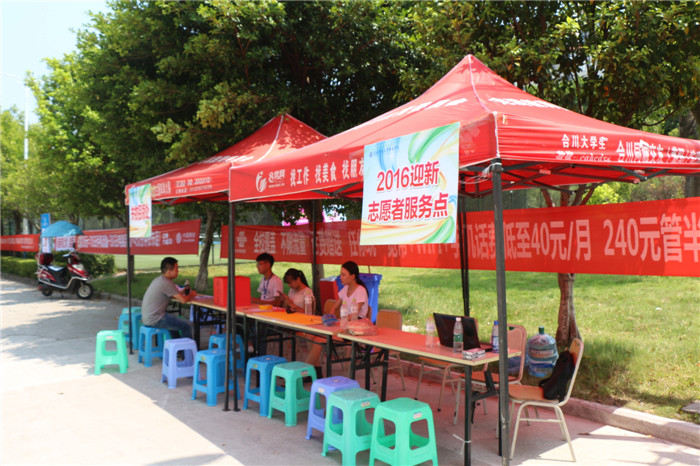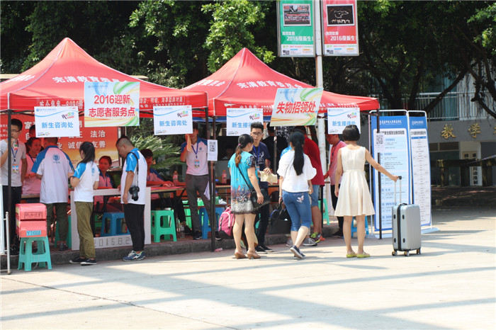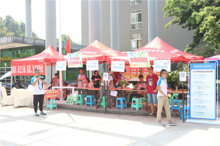 为了迎接提前到校的新生,8月23日,校门前的新生接待点已经布置到位。记者在现场看到,不少服务点已经完成了帐篷的搭建,红色的帐篷和印着各自名称的招牌十分耀眼,起到指引新生报到的作用。而有的迎新工作人员也正在忙碌地组合支架,搬动桌椅和准备资料,为保证迎新工作有条不紊地进行。24日中午,迎新工作正式启动。迎新志愿者已经开始为几位前来咨询的家长和新生服务。他们先是耐心地引导他们去进行入学资格认证,然后到各院系报到,再去图书馆交学费领卡,接着安排住宿,最后到下里巴人领取军训服装后,回到各自宿舍值班室交回程序单完成整个新生入学报到流程。面对不熟悉校园道路的家长们,迎新人员热情地为他们指路。