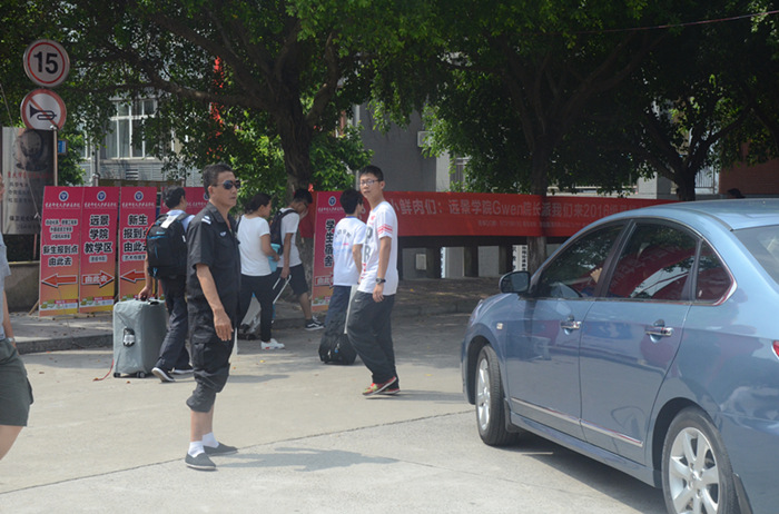 在迎新的大队伍中,有一群默默坚守在岗位上的工作人员——保卫处干部和保安。在大校门前、校园内的各个岔路口、新生接待点、报名缴费点、领取物品点都有他们的身影。无论风吹雨打,他们都恪尽职守,为前来的车辆和新生指引各二级学院的方向和停靠车的地点,保证教学楼、宿舍及整个校园安全,维护校园交通秩序及外来车辆停放调度。