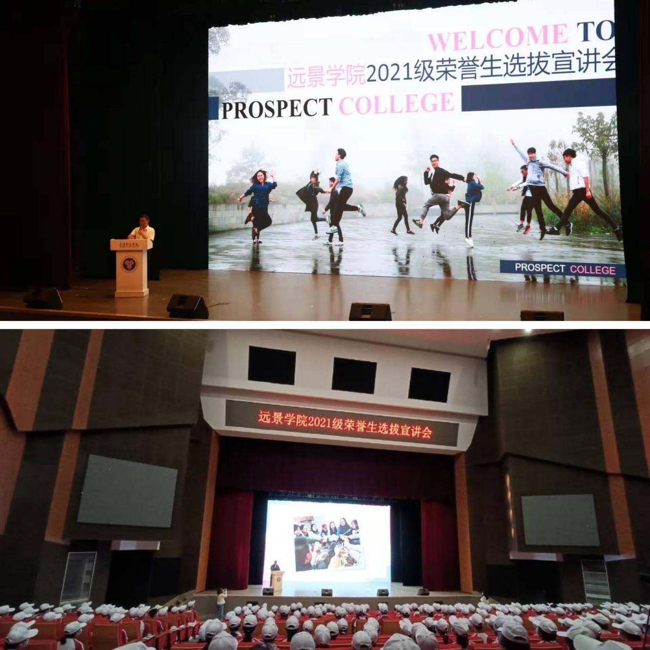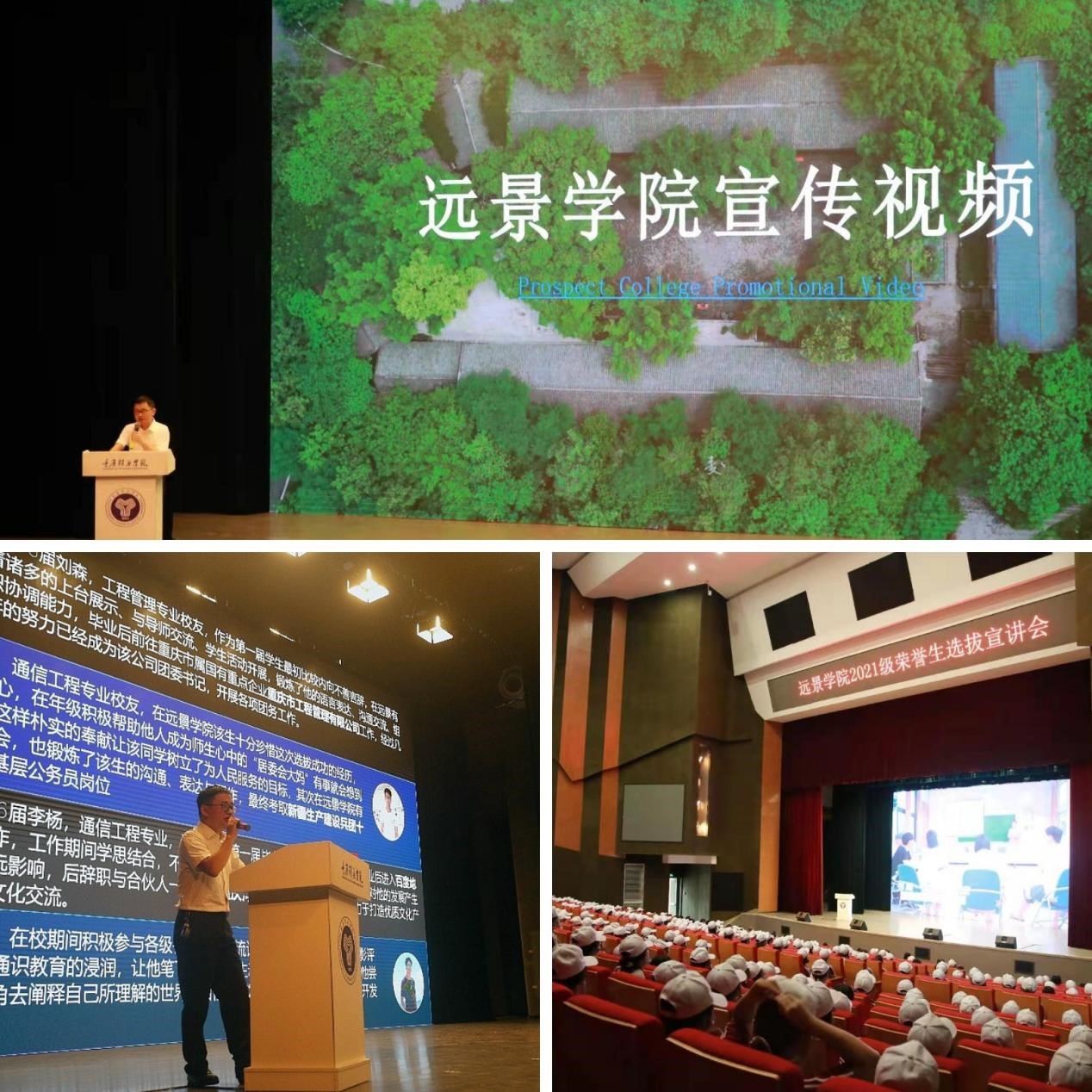年年岁岁花相似,岁岁年年人不同,重庆移通学院又迎来了2021级的新同学们。为了让新生了解远景学院的特色品牌,人才培养、师资力量以及报考政策,远景学院于9月6日在缤果城大剧院面向全校2021级学生们开展了荣誉生选拔宣讲。为了更好支持远景学院的宣传,各学院的院长——数字经济与信息管理学院院长潘显兵,外国语学院院长吴世银,艺术传媒学院院长李轶天、智能工程学院院长党晓圆莅临活动现场鼓励新生报考。远景学院执行院长皮若兰、学工副院长李军,学院辅导员、在校教师参与本次宣讲会。2000名新生和远景学院的师生齐聚一堂,共话远景故事,开启远景学院2021年新生招募的新征程。