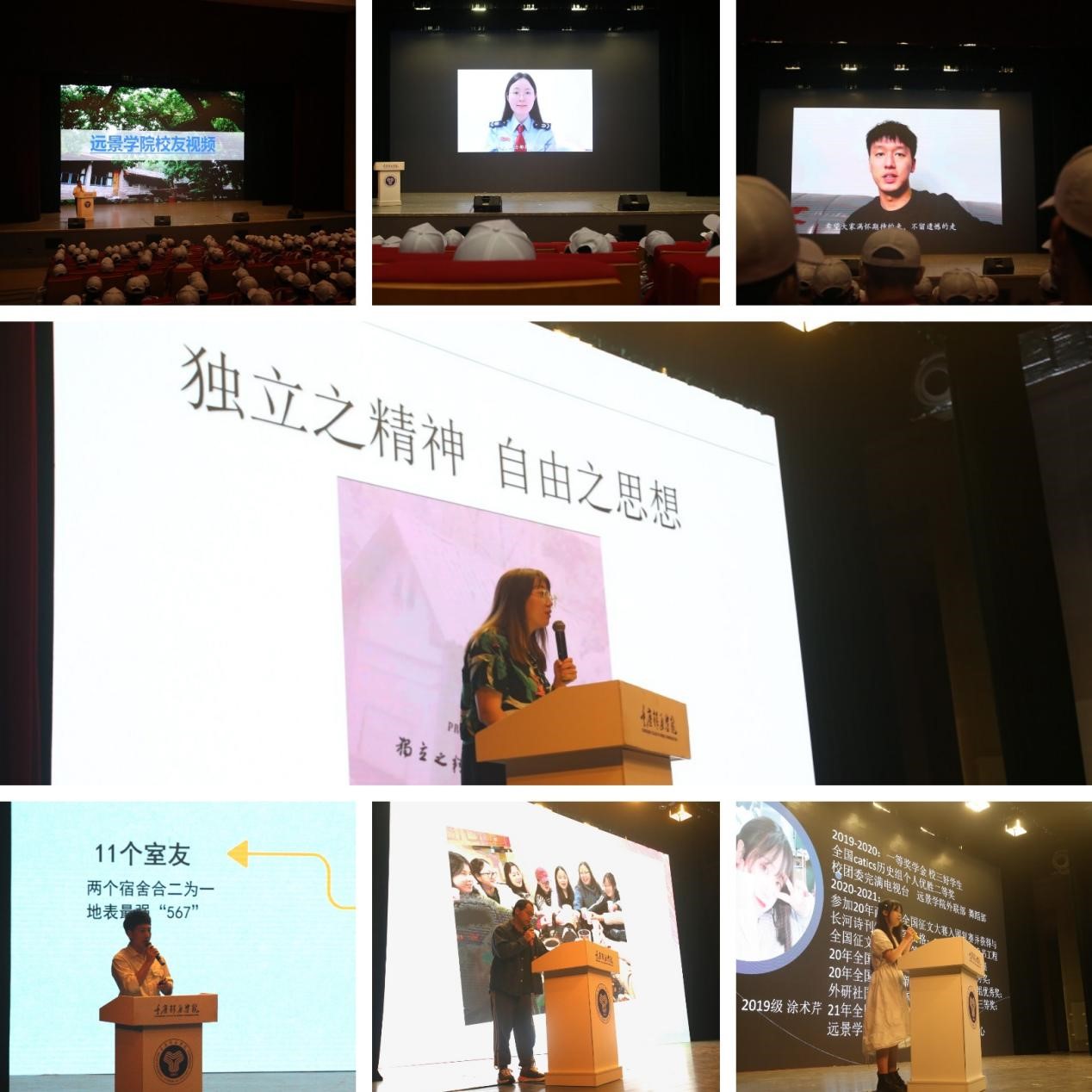 在校友分享环节,远景学院的学姐学长们用自己在学院四年学习、生活、就业的经历讲述了在远景的回忆与经历,让新生们了解到真实而独特的“远景生活”,让大家知道了在远景学院能够极大挖掘自己的兴趣,找到适合的圈子,促进跨学科融合进而在热爱的领域深耕。优秀毕业生校友分布在全国各地及海外,有的加入基层公务员,有的进入知名企业,有的则考研留学,通过视频发出对新生们的寄语,希望学弟学妹们也能够加入到他们的母校,体验他们所感受的美好。