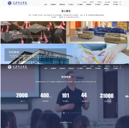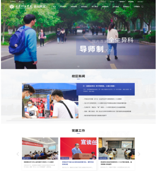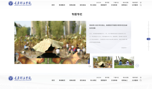 校园官方网站作为品牌形象代表之一,品宣部门2022从“新”出发,全心打造新官网建设。进一步推进学校信息化建设工作,健全信息化项目建设机制,成立 2022 年信息化建设项目小组,迅速在全校范围内发布《关于征集重庆移通学院校园网站建设升级意见的通知》,收集到全校各个单位建设意见,迅速整理归纳后,联合网络与信息管理中心、校团委等部门进行交流讨论,并结合全国高校案例制定初步建设方案。根据各方意见以及学校办学理念确定了官网和双校区网站主要构成(栏目),进行视觉设计指导,提出整改意见,期间与相关部门、网站设计公司开展校园网站建设工作推进会线上线下30余次。交互式的网页设计、移通蓝的规范页面、图文并茂的分类介绍等层出不穷的设计方式,力争在焕然一新的官网上呈现品牌个性与差异化,提高读者兴趣度,便捷用户体验感,加深用户喜爱度,扩大品牌知名度。