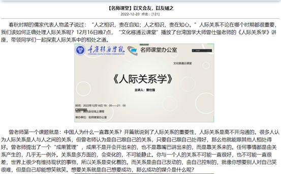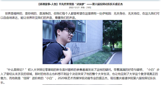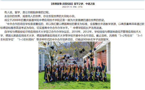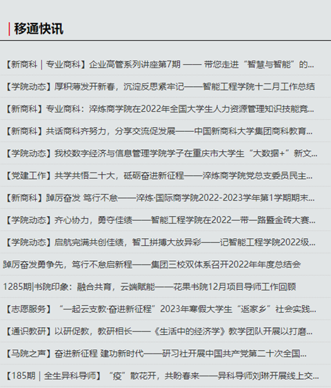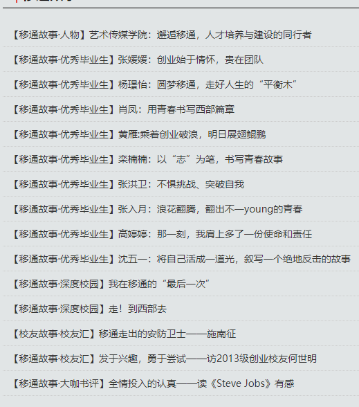 在官网固定板块基础上,品牌营销与新闻中心精心策划打造专题爆款栏目——《移通故事》,板块内容包括《移通故事·我在书院读大学》《移通故事·人物》《移通故事·优秀毕业生》《移通故事·深度校园》《移通故事·校友汇》《移通故事·大咖书评》《移通故事·服务东奥专题报道》《移通故事·信箱投稿》等栏目。整个设计立足移通整体,以小见大视角,深入观察校园,用倾心的采编,有温暖的笔触,记录校园里的一草一木、一物一情。据统计,全年专栏共发布108篇文章,阅读量总计达34.8W。通过精品专栏,对内对外展示移通风采,聚力品牌形象,并多次被《重庆日报》《学习强国》等媒体转载报道,自推出以来,广受读者们的喜爱。
