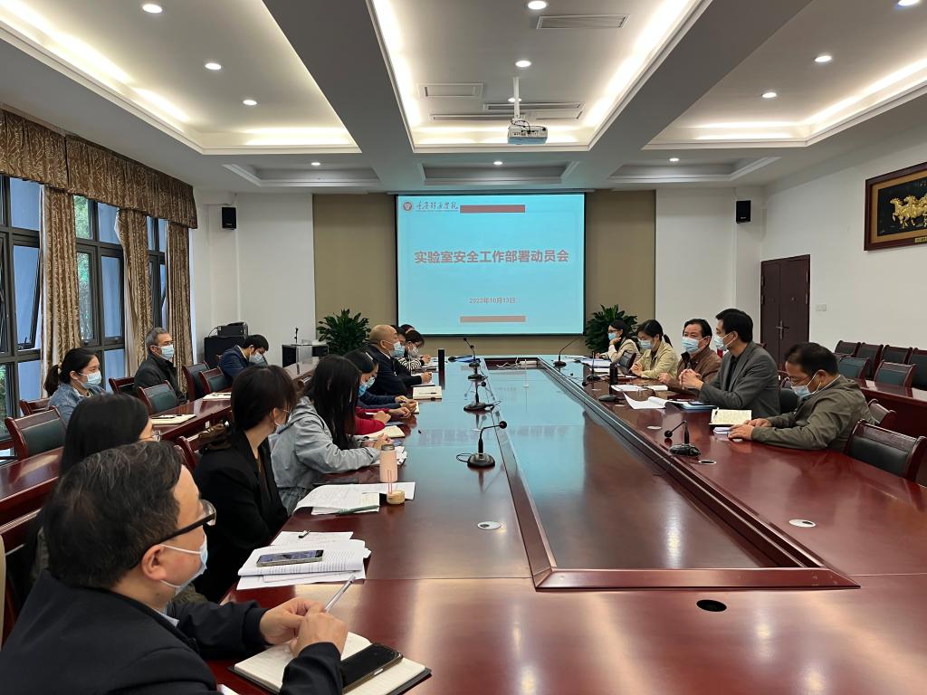 为全面落实全国高等学校实验室安全工作会议和全市迎接党的二十大安全稳定工作会议精神,确保高校实验室安全有序运行,我校严格遵照市教委相关文件要求,于10月13日下午在行政楼107会议室召开“实验室安全工作部署动员会”,学校校长张德民、副校长周伟、校长助理尹浩亮,实训中心、教务处、保卫处、资产管理处、基建后勤处、网络与信息管理中心、有归属实验室的二级教学单位负责人出席会议。本次会议由校长助理刘枚主持。