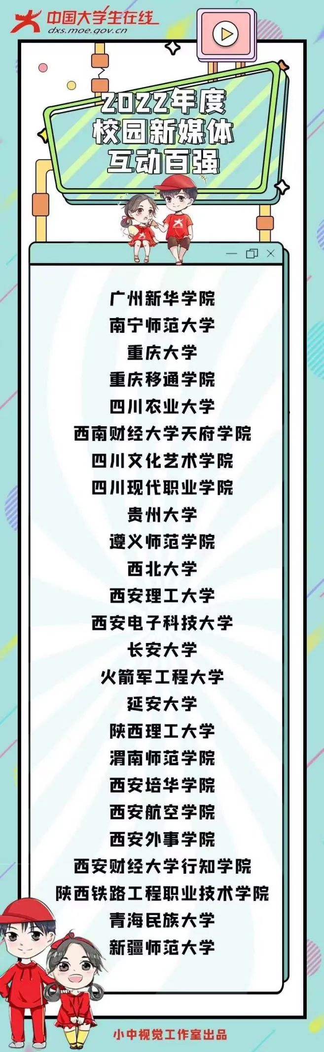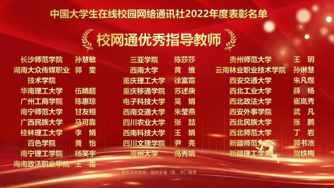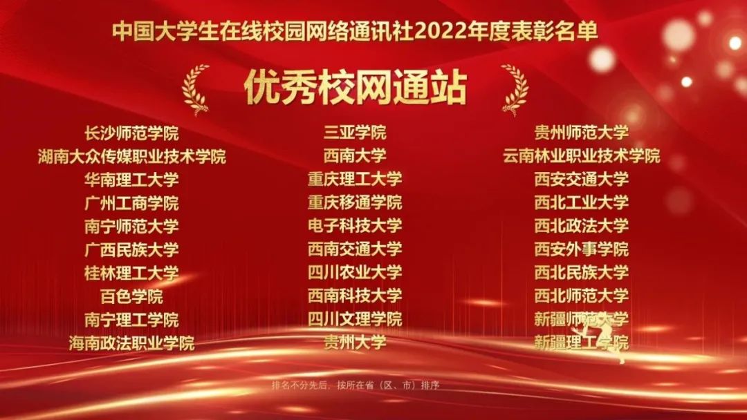 学校荣获“2022年度优秀校网通讯站”,学校宣传新闻中心入选“2022年校园行优秀组织单位”,宣传新闻中心主任苏述庚荣获2022年度校网通优秀指导教师,艺术传媒学院张艺玮同学入选2022年度优秀校园媒体人。同时,新媒体账号入选中国大学生在线2022年度校园新媒体互动百强。