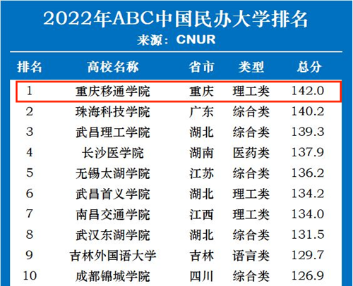 2022年5月18日,由ABC咨询机构编制的2022年ABC中国民办大学排名(原“中国民办大学百强榜”)权威发布,我校以142.0的总分从2021年的第三跃升为全国民办大学第一!这是权威评价机构对我校办学定位和人才培养模式的充分肯定和认可!