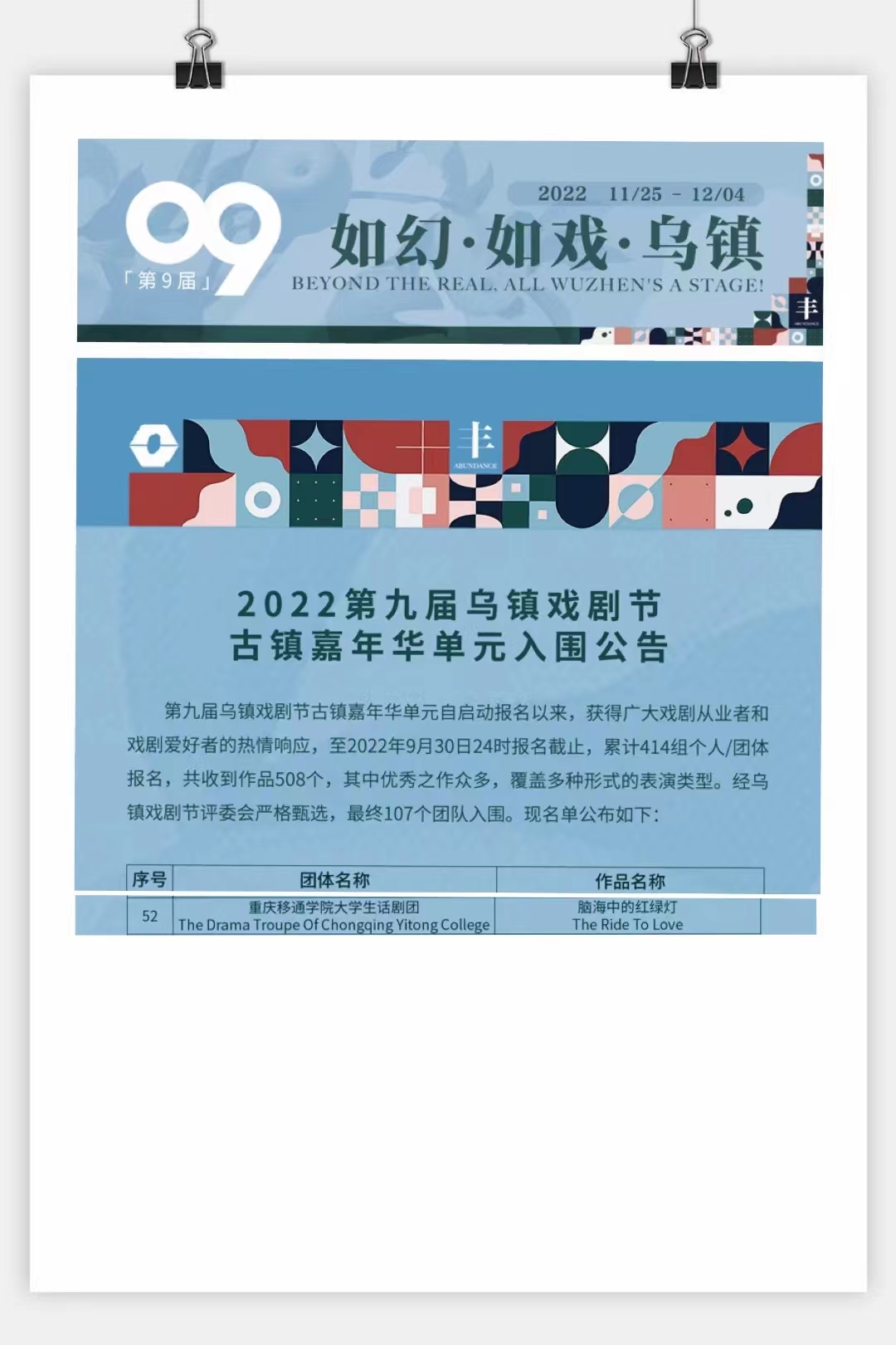 重庆移通学院原创实验剧《脑海中的红绿灯》首次入围2022年乌镇国际戏剧节古镇嘉年华单元,这也是首次登上国际舞台。