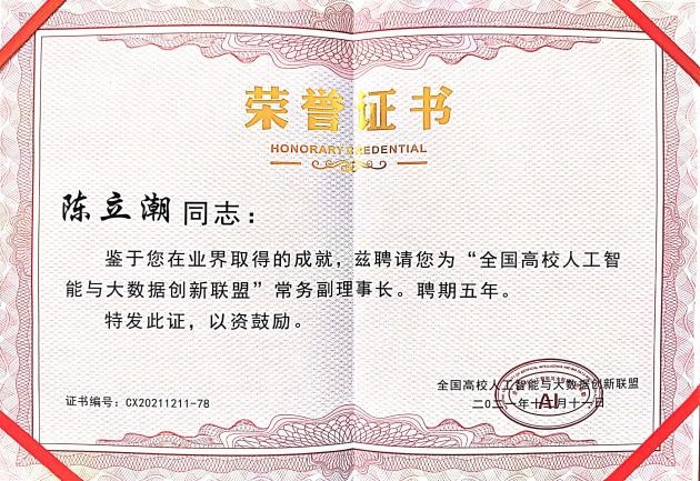 本次论坛鉴于陈立潮教授在业界取得的成就和影响力,再次连聘为“全国高校人工智能与大数据创新联盟”常务副理事长,聘期五年。同时,鉴于他在教育教学中的突出成绩,荣获2021年度全国人工智能大数据区块链教育教学“突出贡献奖”。
