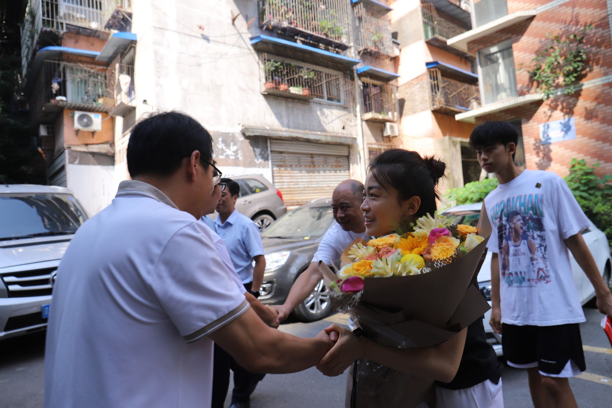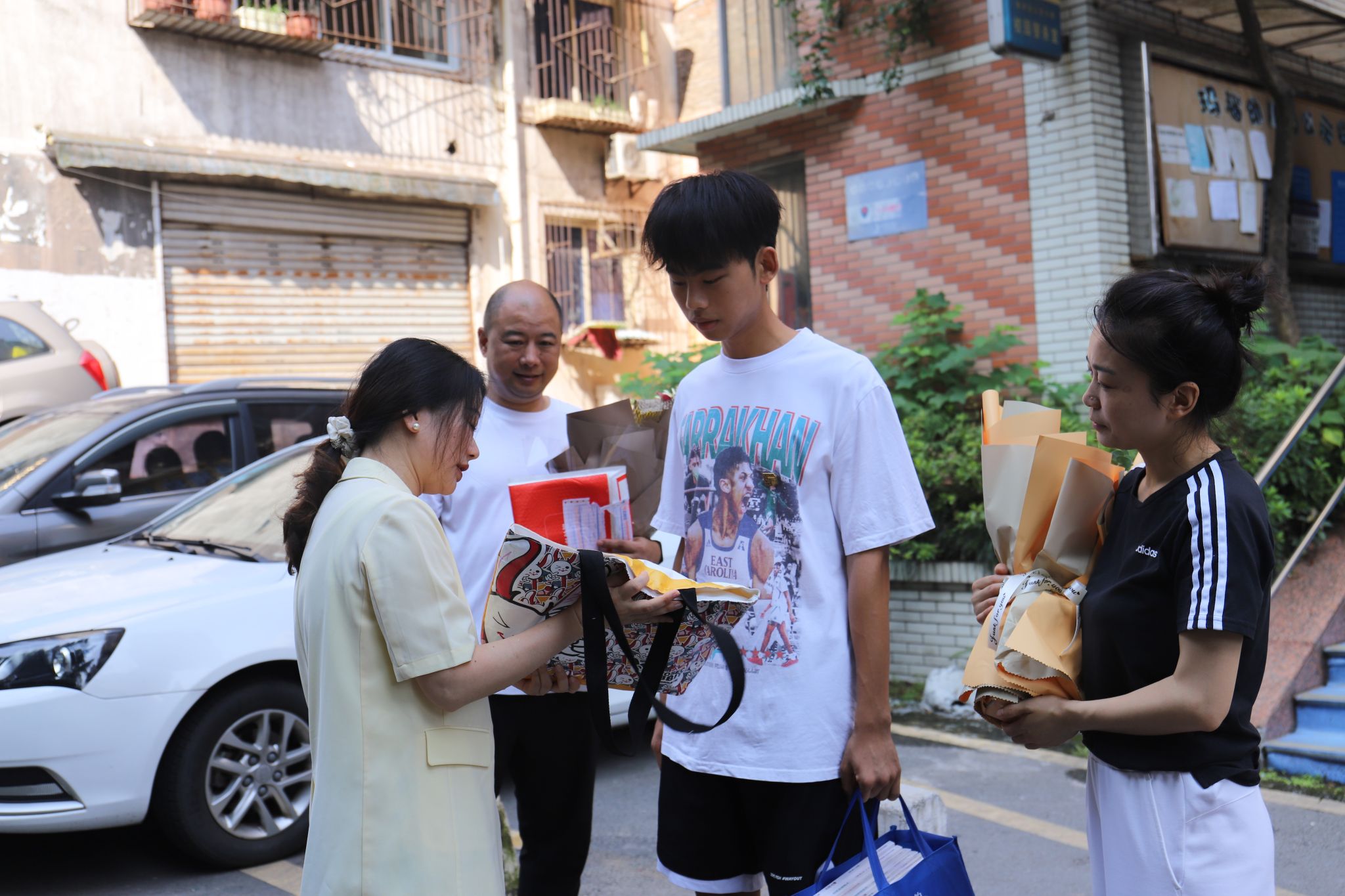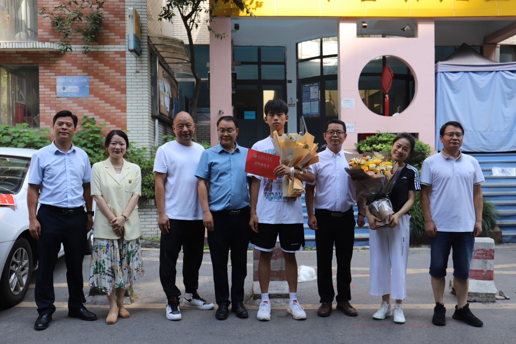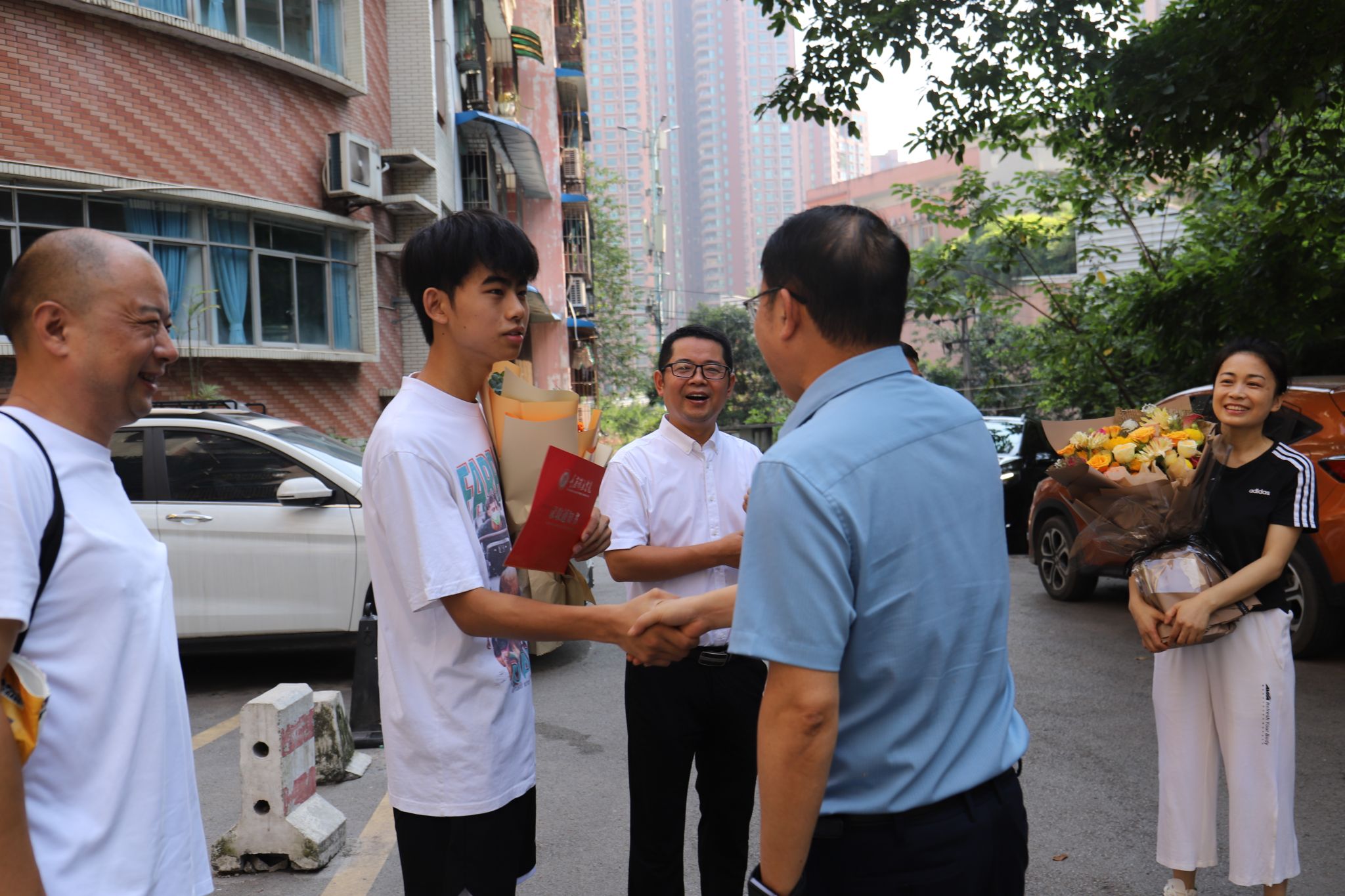 今日上午10点,我校党委书记何先刚,常务副校长王永周,戏剧影视学院院长王芳,党委组织宣传部部长苏述庚,招生处处长张成川等一行人来到重庆市南岸区,将学校今年秋季高考的第一封本科(艺术)录取通知书送到了杨若愚同学手中。