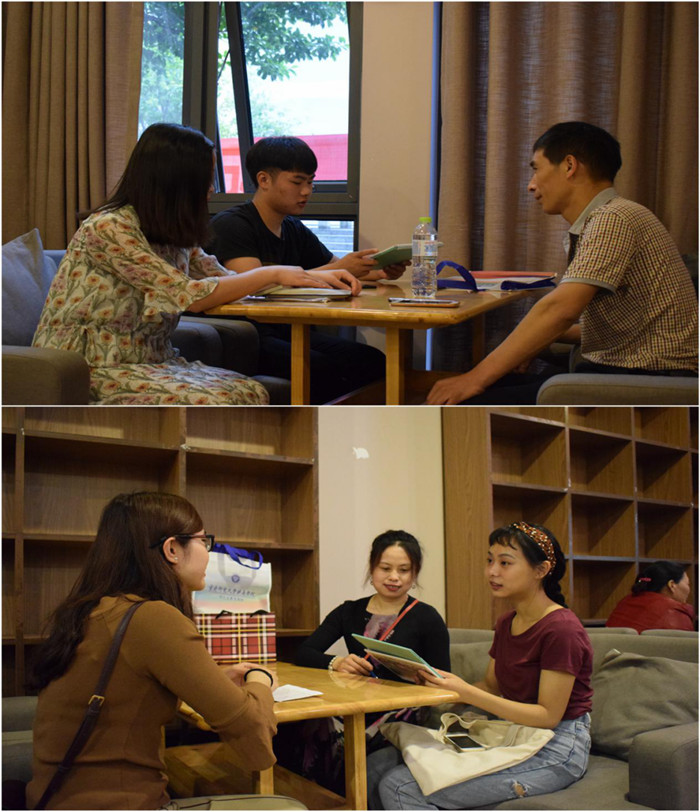 管理工程系2017级辅导员王冰倩、杨进老师热情接待了前来参加校园开放日的家长,并邀请家长们到咖啡厅就坐。家长刚一坐下就迫不及待地向辅导员询问自己孩子在学校的学习和生活情况,“老师,我家这孩子比较淘气,在学校他没给您添麻烦吧?”“老师,我家孩子学习怎么样啊?”“老师……”。辅导员耐心地为家长一一解答,为每一位家长解决所有的困惑。