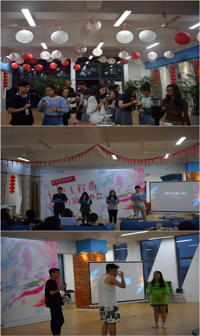 当晚7点,社团活动室举办了本次校园开放日的交流酒会,家长与自己的孩子结伴前来。管理工程系的学生向家长们献上了精心准备的歌舞朗诵,催人泪下的小品《父亲》。酒会中的亲子互动环节更是拉近了家长与孩子的距离,幸福的笑容温暖了充满凉意的夜晚。