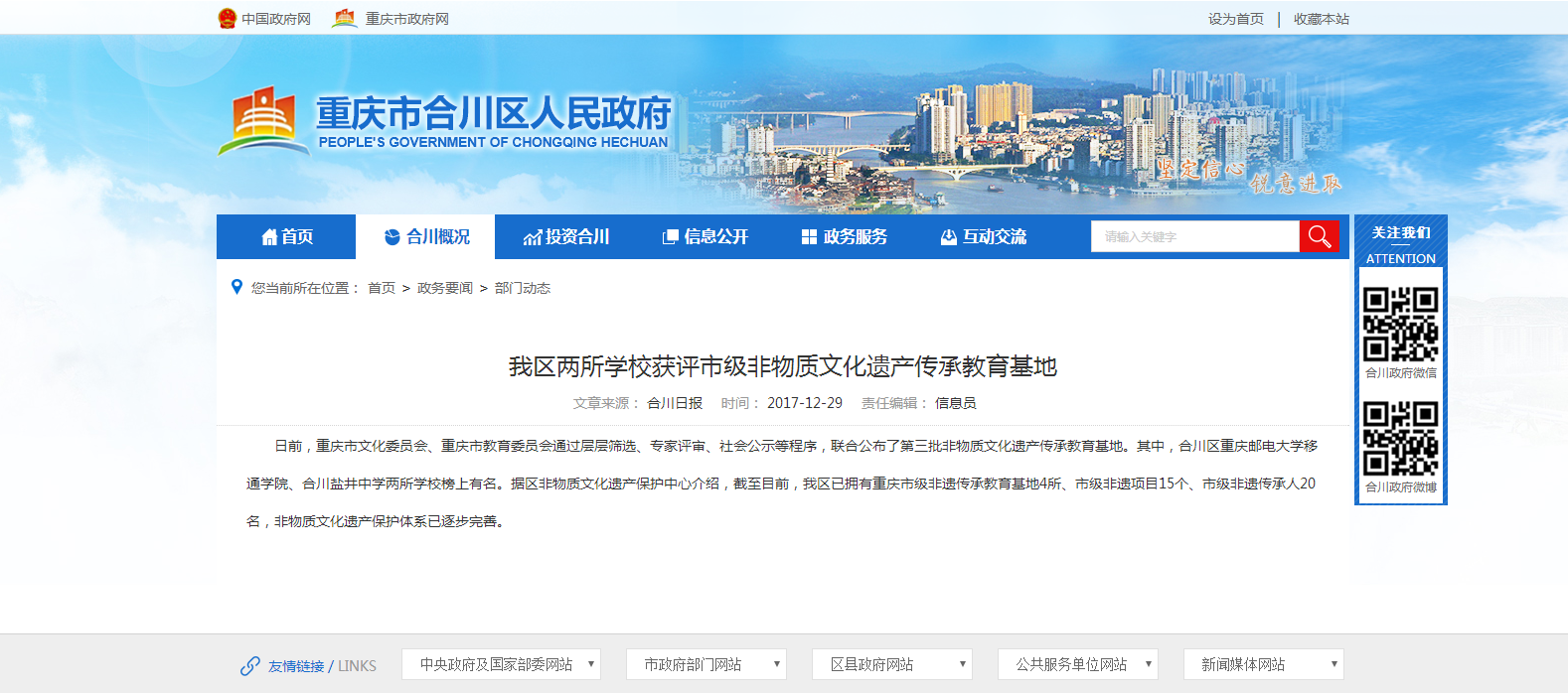 日前,重庆市文化委员会、重庆市教育委员会通过层层筛选、专家评审、社会公示等程序,联合公布了第三批非物质文化遗产传承教育基地。我校榜上有名。