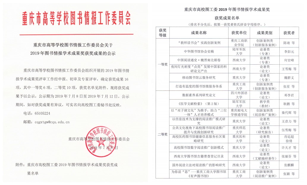 此次由重庆市高等学校图书情报工作委员会组织开展的2019年度图书情报学术成果奖,经申报、初审及专家组评审,并经图工委审核及公示,共评选出获奖成果16项,其中一等奖6项,二等奖10项,我校为独立院校中唯一获奖的学校。