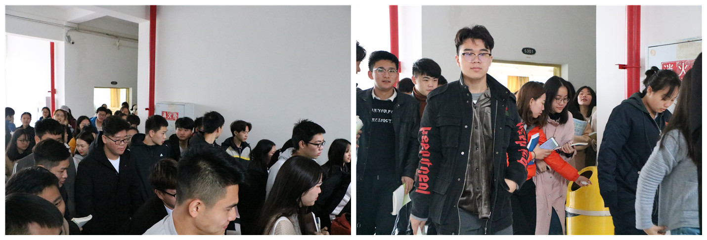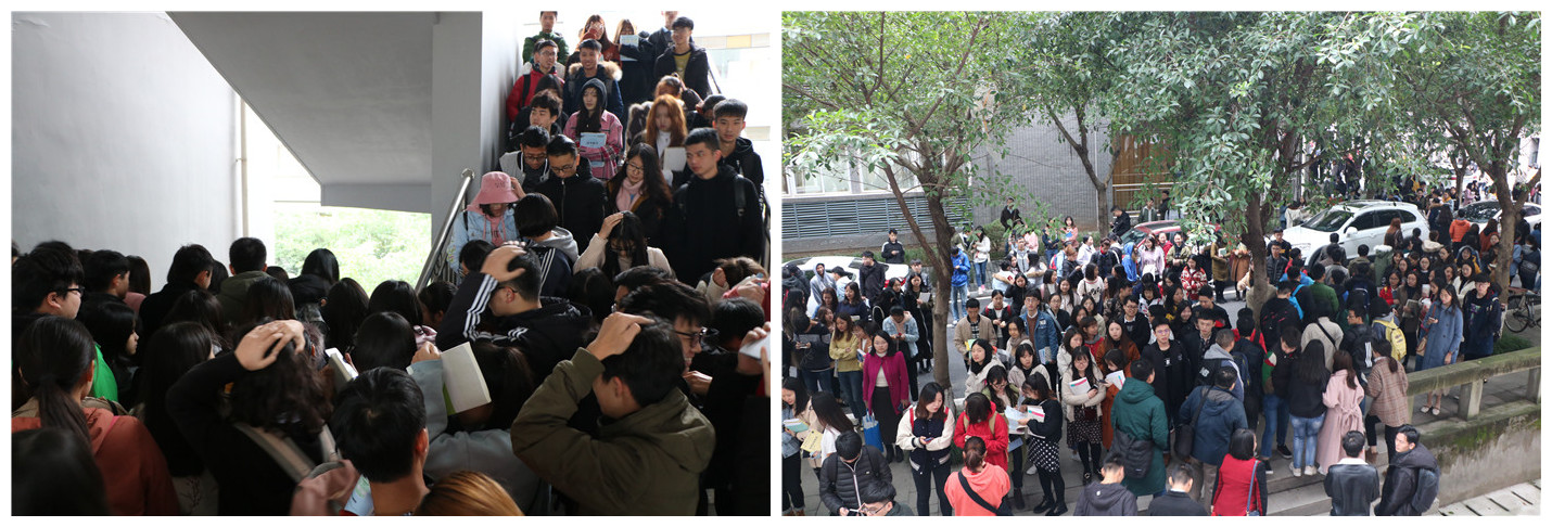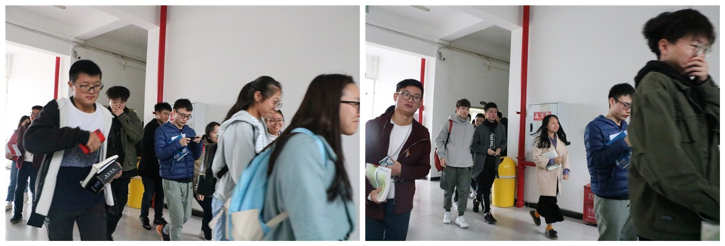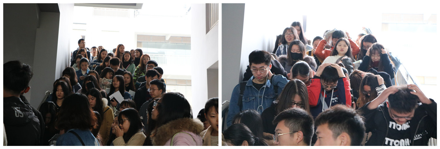 上午9点40分,南校区教学楼火灾应急疏散演练正式开始。随着第一声警报的响起,演练正式开始。在任课老师和辅导员的有序引导下,同学们猫着腰,抱着头,用润湿的纸巾或衣服掩住口鼻,分别从前后门紧张、有序、快速地撤离教室,按预案规定的疏散路线到达指定集结区域,并有效率地排好队。辅导员及时清点并上报了各班人员情况。