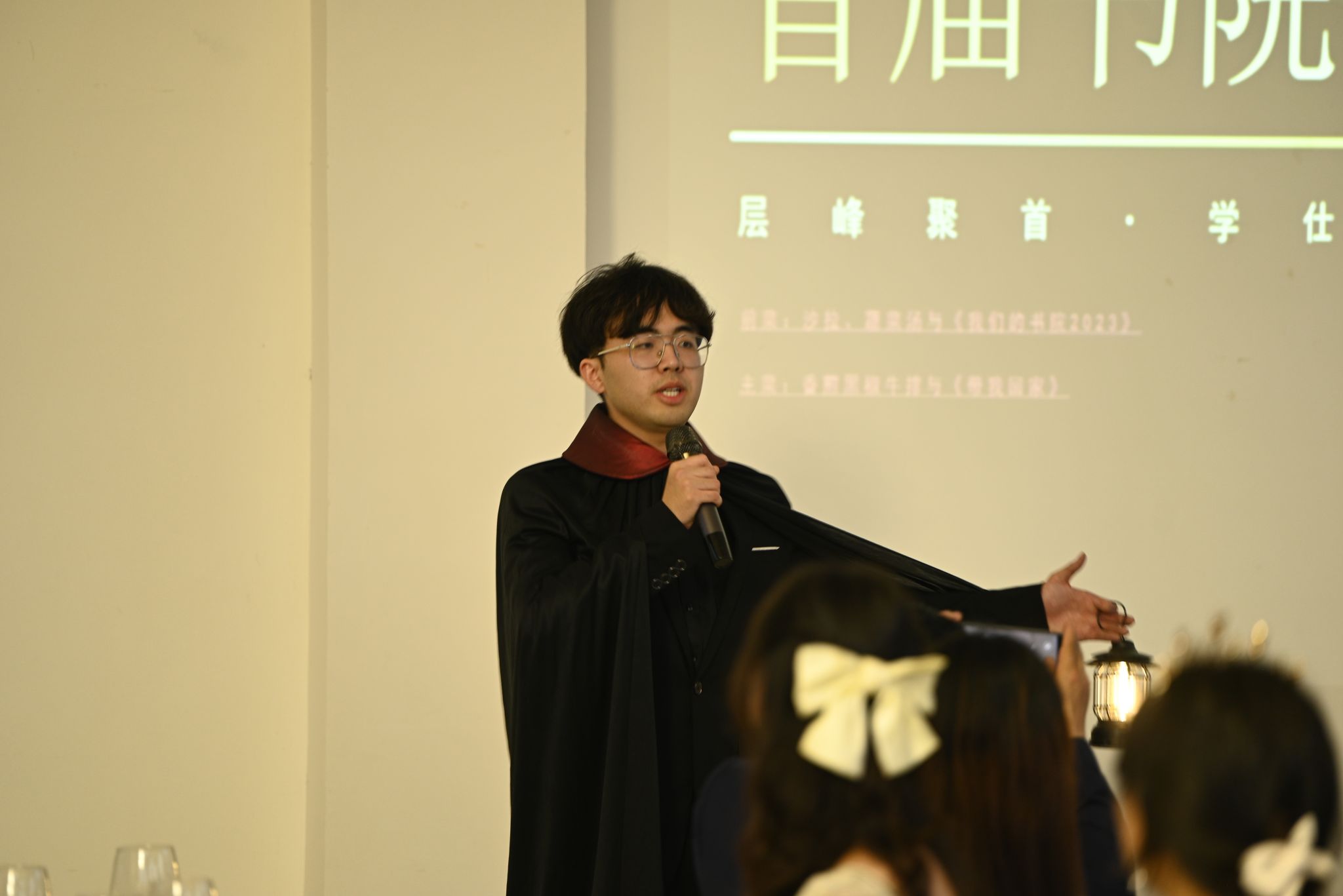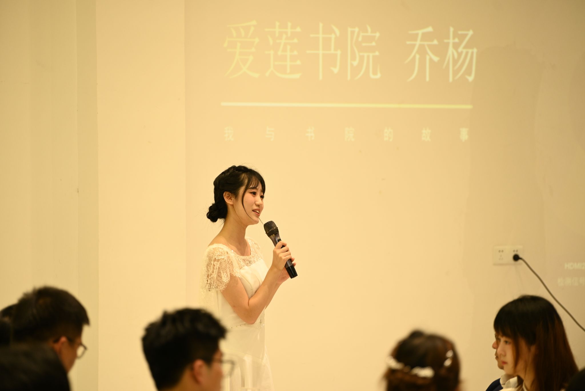 书院的发展,离不开台前幕后所有工作人员的努力,晚宴邀请到学生代表爱莲书院的乔杨同学,讲述她和书院的故事。乔杨同学回顾了自己三年来在书院的成长经历,从大一的新手小白到现在独当一面的基地总经理。在她看来,学习永无止尽,她永远在尝试挑战自己。这条拼搏前进的道路,不仅有书院同窗的陪伴,也有书院老师的殷切帮助,对书院最深的印记,是每一次主持前老师不辞辛劳帮忙修改的稿件,也是每一次迷茫不知所措时老师关切的叮嘱和坚定的鼓励。大三时她加入了双体软件经营产业学院,每天朝九晚十的生活尽管压力巨大,但也收获颇丰。点点滴滴,日积月累,奋斗的汗水浸润着她和书院一起成长的完满之路。