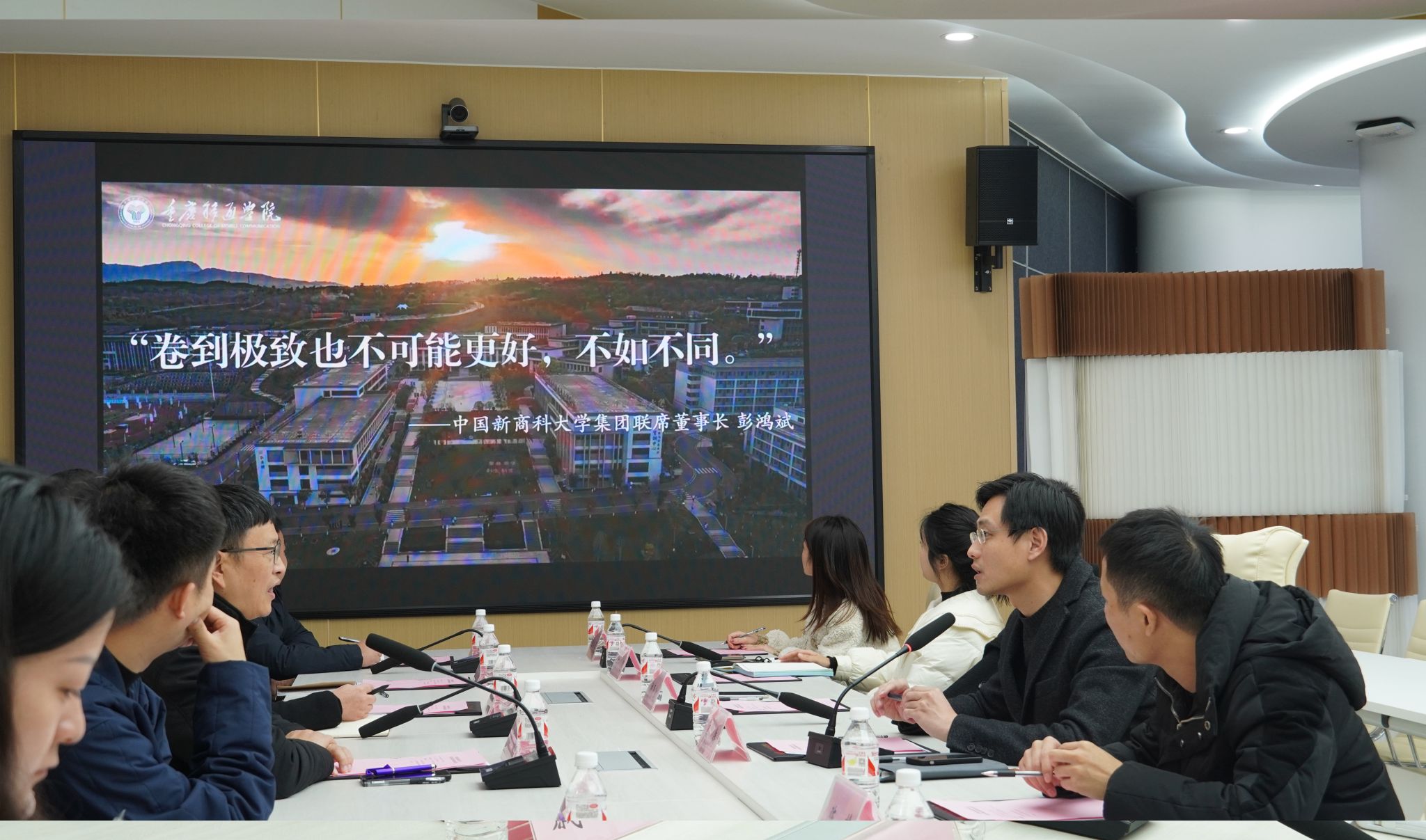 参观结束后,双方在天空书院云端会议室举行了交流座谈会。会上,我校党委副书记、常务副校长周伟首先对重庆机电职业技术大学一行的到来表示热烈欢迎,并简要介绍了我校的发展历程、办学理念、特色项目及近年来取得的成就等情况。团委书记、书院部部长穆春江随后详细介绍了我校完满教育相关情况。重庆机电职业技术大学何超副校长对此表示感谢,并分享了重庆机电职业技术大学的发展理念与近期工作重点。双方一致认为,面对新时代高等教育的新要求,两校应进一步加强合作,共同探索学生管理、实践教学等方面的创新路径,共同提升人才培养质量和社会服务能力。