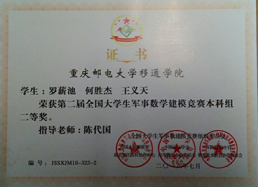 由中国兵工学会应用数学专业委员会、中国人民解放军南京地区院校协作中心、军队院校士官职业技术教育协作联席会共同主办的第二届全国大学生军事数学建模竞赛成绩揭晓,今年我校首次仅选派了3支参赛队参赛,经过四天四夜的刻苦钻研、团结协作,获得2018年第二届全国大学生军事数学建模竞赛二等奖1队, 三等奖1队的好成绩。