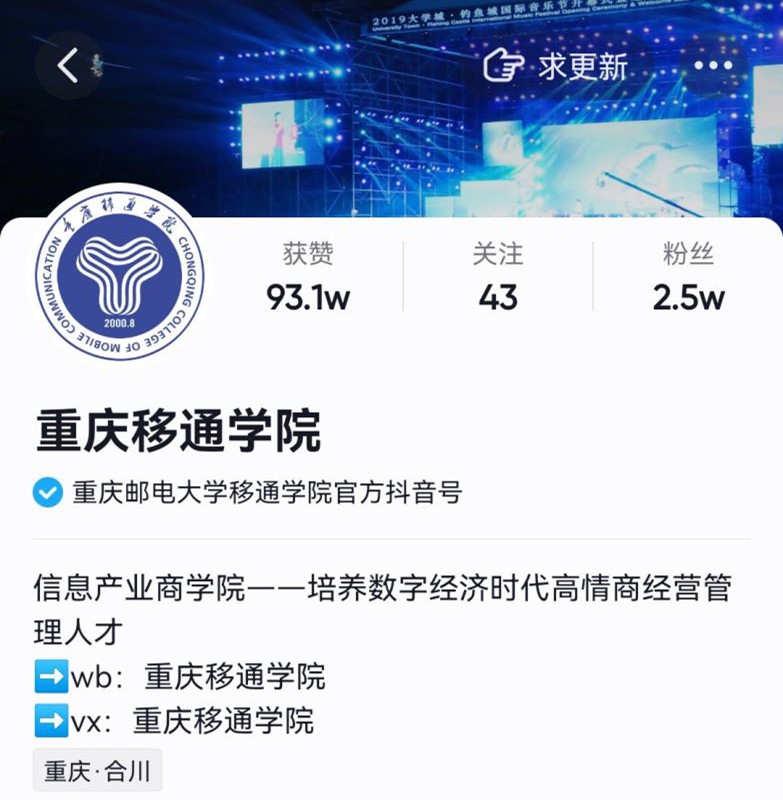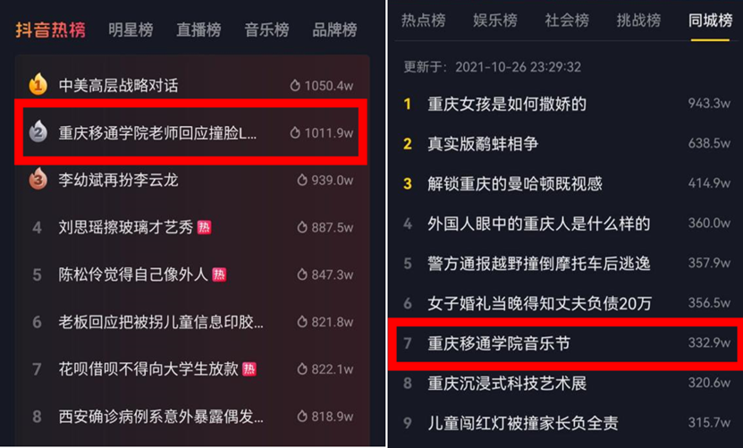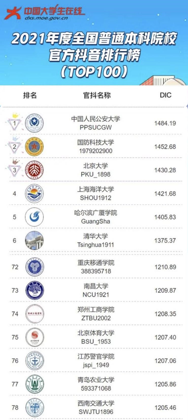 3月29日,教育部中国大学生在线发布《2021年度全国普通本科院校官方抖音排行榜》,我校官方抖音号“重庆移通学院(388395718)”以影响力指数(DIC)1210.89居全国榜第72位,是重庆市唯一上榜的本科院校,是全国百强榜中为数不多的民办高校。