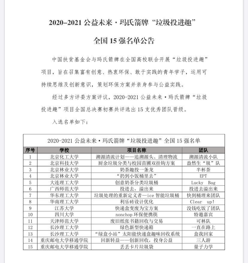 近日,中扶贫基金会公布2020-2021公益未来·箭牌“垃圾投进趣”全国青年公益实践大赛全国15强名单,我校“回新转益—创新回收,投身公益”“丢丢卡片垃圾袋”2个志愿服务项目从全国1200余个项目中脱颖而出,成为唯一晋级全国赛复赛的民办高校(独立学院)项目。