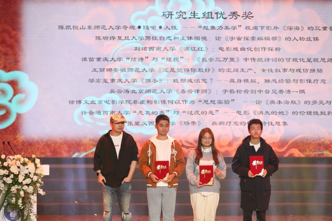 最后,尹鸿教授发表讲话。他表示,本次大赛的成功举办,离不开重庆市文联、重庆市电影家协会、重庆市文艺评论家协会、重庆市委宣传部的大力支持,作为本次活动主办方,重庆移通学院建立电影评论中心并聘请众多专业教师指导,不仅是对电影生态文化起到有力作用,也是学校高度重视学生德智体美劳全面发展的大力举措。同时,他引用电影《长安三万里》的“诗在,长安就在”提出“情在,影评才在”,影评作品连接起电影创作者与影评人,也是电影与观众之间的桥梁,更是影评人写给电影的情书。本次大赛收到作品整体专业水平较高,体现了年轻一代的蓬勃朝气与学术素养。电影评论要把对电影的感受放到首位,抛去华丽的词藻,希望新一代影评人用心实感撰写优秀感人影评作品。