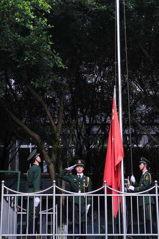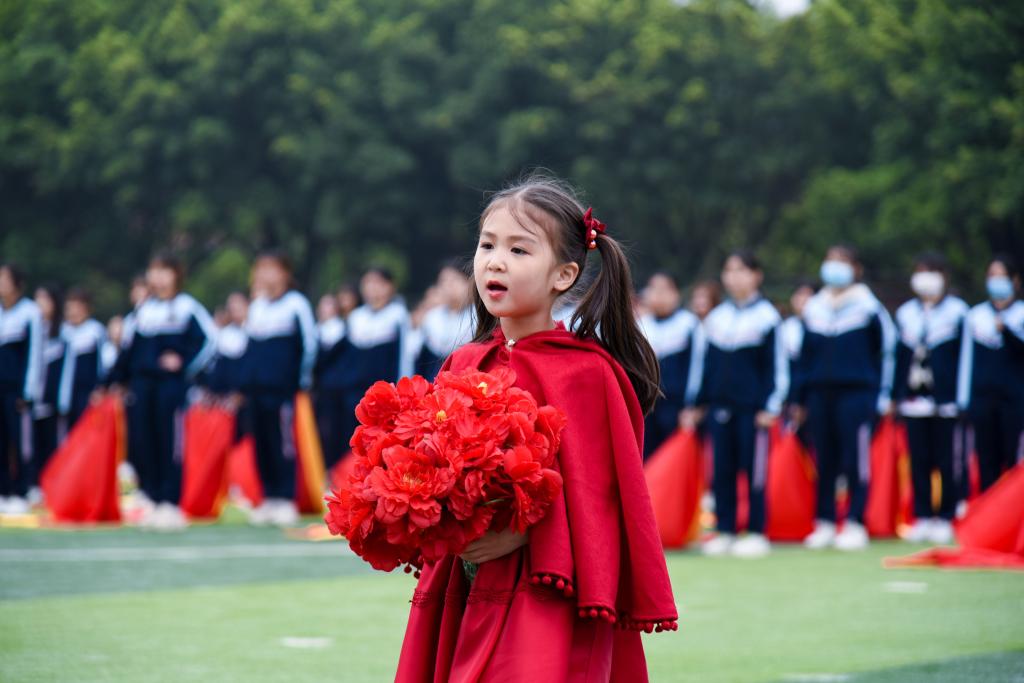 各代表方队整齐列队完毕,全体师生领导全体肃立,奏国歌,行注目礼。国歌荡漾在万人运动场上空,气势昂扬。