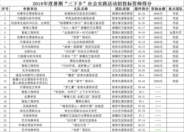本次暑期“三下乡”社会实践活动招投标答辩大会取综合得分排名前15个团队进入校级团队(包括市级团队),并按综合分,分为A、B、C三类,其中A类占20%,将获得经费资助4000元,并根据情况推荐为市级团队;B类占40%,将获得经费资助3000元,并根据情况挑选部分团队推荐为市级团队;C类占40%,将获得经费资助2000元,确定为校级重点团队。并在2018年9月三下乡队伍将进行成果汇报、组织答辩、现场成果展示。对在“三下乡”期间表现突出的团队和个人集中表彰,组织召开“三下乡”表彰总结大会。