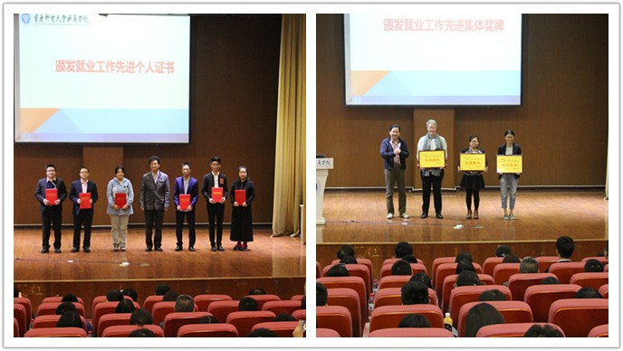 随后,学院副院长王征宣读表彰文件,远景学院、自动化系、外国语言文学系获评就业工作先进集体,廖阳、卢伯年、纪治阳、刘桃、王万福、霍佳璐六名老师获评就业工作先进个人,学院院长张德民教授与党委书记苏开荣教授分别为先进集体和先进个人颁发奖牌和荣誉证书。