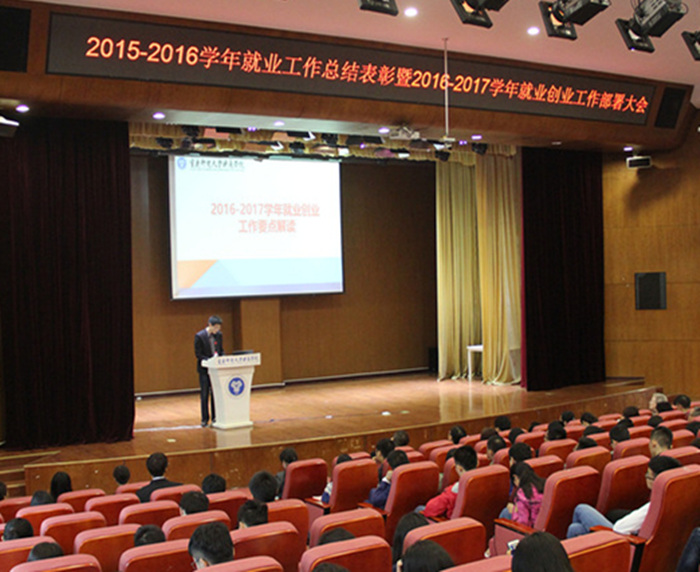 10月27日我校召开的2015-2016学年就业工作总结表彰暨2016-2017学年就业创业工作部署大会全面总结了2016届毕业生的就业工作,并对新学年的就业创业工作进行了安排与部署。上午10:30,就业创业工作总结部署大会在下里巴人剧场隆重举行,院长张德民教授、党委书记苏开荣教授、副院长王征、院长助理尹浩亮出席会议,学生处副处长陈家凤、就业创业指导与服务中心主任陈仲华、各院系就业创业工作领导小组成员、辅导员及近400名学生代表参加了本次会议。会议由院长助理周伟主持。