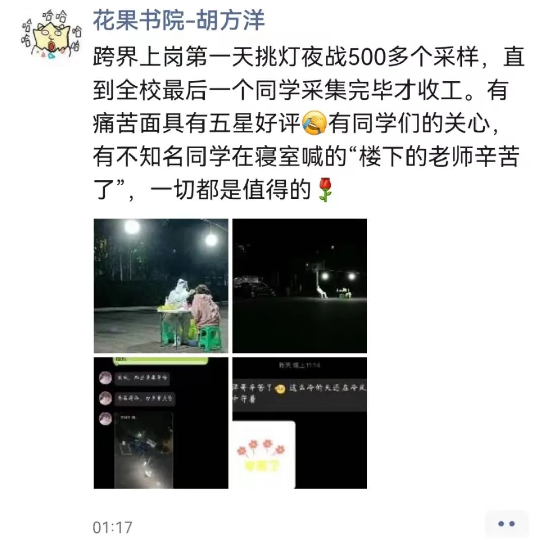 核酸检测教师志愿者胡方洋说道:“如果有人问核酸志愿者累不累,真的累,穿着防护服坐在寒风中动辄就是几个小时,要确保每一次核酸采样的质量,保证所有的采样标本数据无误,对于一个‘跨界’采样的志愿者来说还是有一定压力的。第一天采样,为了保证核酸采集不漏一人,尽管已经凌晨,依然坚守在采样点,当寝室楼上传来了一声声‘楼下的老师辛苦了’,那一刻,虽然天是冷的,但心是暖的。病毒无情,师生有爱,为了早日看到熟悉的书院不再有教师志愿者忙碌、疲惫的身影,恢复往日的欢声笑语,作为书院家人守护书院学子责无旁贷,唯有坚持,我们终将迎来胜利。”
