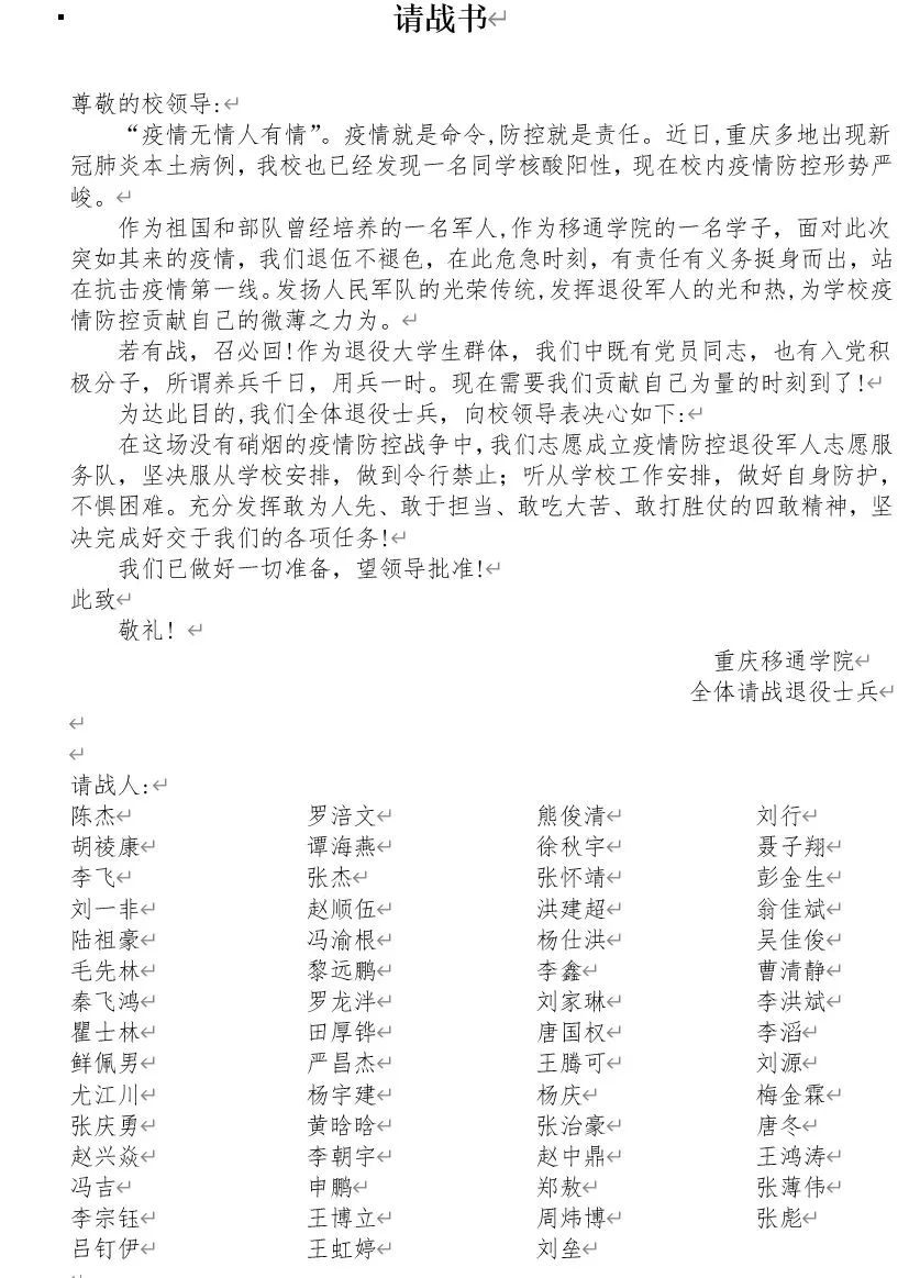 退役军人学生志愿者们服从调度,利用课余时间参与到巡逻中来。“我们中既有党员同志,也有入党积极分子,所谓养兵千日,用兵一时。充分发挥敢为人先、敢于担当、敢吃大苦、敢打胜仗的四敢精神,坚决完成好交给我们的各项任务。”退役军人学生志愿者陈杰不仅积极参与学校防疫志愿服务,还影响带动全校退役军人学生也加入战“疫”队伍。