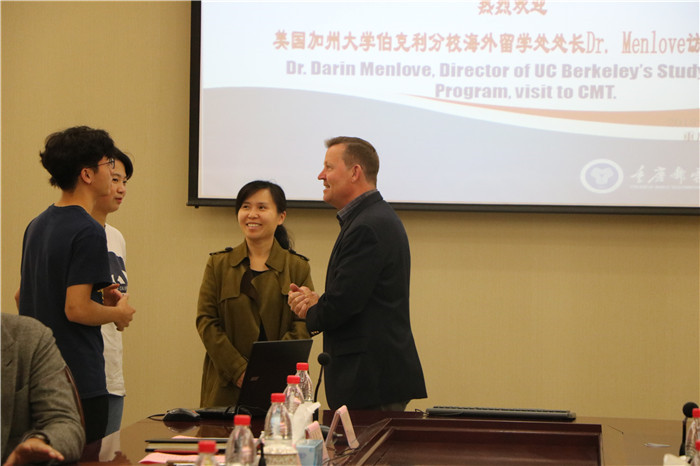 “重庆邮电大学移通学院于2000年建校,2007年搬到合川区办学,是一所年轻的学校,也是一所有特色、有理想、有抱负的学校。我校和德国高校合作办学的中德应用技术学院有在校生1700人左右,我们有教育部批准的中外合作办学项目。每学年,我校还会选派200余名师生赴英国、美国、德国、比利时、新加坡等国家进行长短期交流学习。远景学院和中德应用技术学院是我校国际化办学的重要标志,培养了一大批国际化人才,中德应用技术学院亦是西南地区首屈一指的中外合作办学机构。”尹浩亮助理向Menlove处长介绍了我校的国际化办学情况,他表示派去伯克利分校的都是我校最优秀的学生,伯克利项目也将持续开展下去。