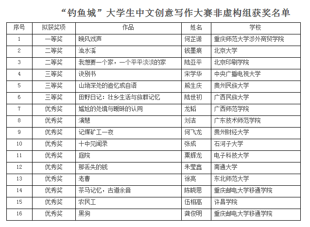 “‘钓鱼城’大学生中文创意写作大赛仅以‘虚构组’‘ 非虚构组’划分,不限制参赛作品的体裁与主题,鼓励大学生进行自由写作,极大地激发了大学生的创造性思维。大赛以高额奖金和华丽评委阵容,吸引了全球各地以中文写作的当代大学生,同时也繁荣了重庆的文学创作。重庆邮电大学移通学院董事长彭鸿斌博士为推动创意写作在中国的发展,斥巨资打造文学大奖,帮助当代大学生实现文学梦想,有此情怀和社会担当,让人敬佩。”著名作家、重庆市作协主席陈川如此评价。