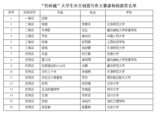 “钓鱼城”大学生中文创意写作大赛由重庆邮电大学移通学院创意写作学院(CWS)主办,北岳文艺出版社协办,重庆市作家协会指导。自2016年11月6日大赛开幕以来,重庆邮电大学移通学院面向全球大学生征集中文写作“虚构”和“非虚构”文学作品,收到来自全球各地有效稿件2071部,字数合计1412.634万字。投稿者来自全国各省市,也有来自海外的稿件。大赛组委会聘请国内一流的作家、出版家、评论家、学者担任评委,以公平、公正、公开的方式遴选优秀稿件,经过初评、复评、终评三轮评审,最终共有31篇优秀稿件脱颖而出。