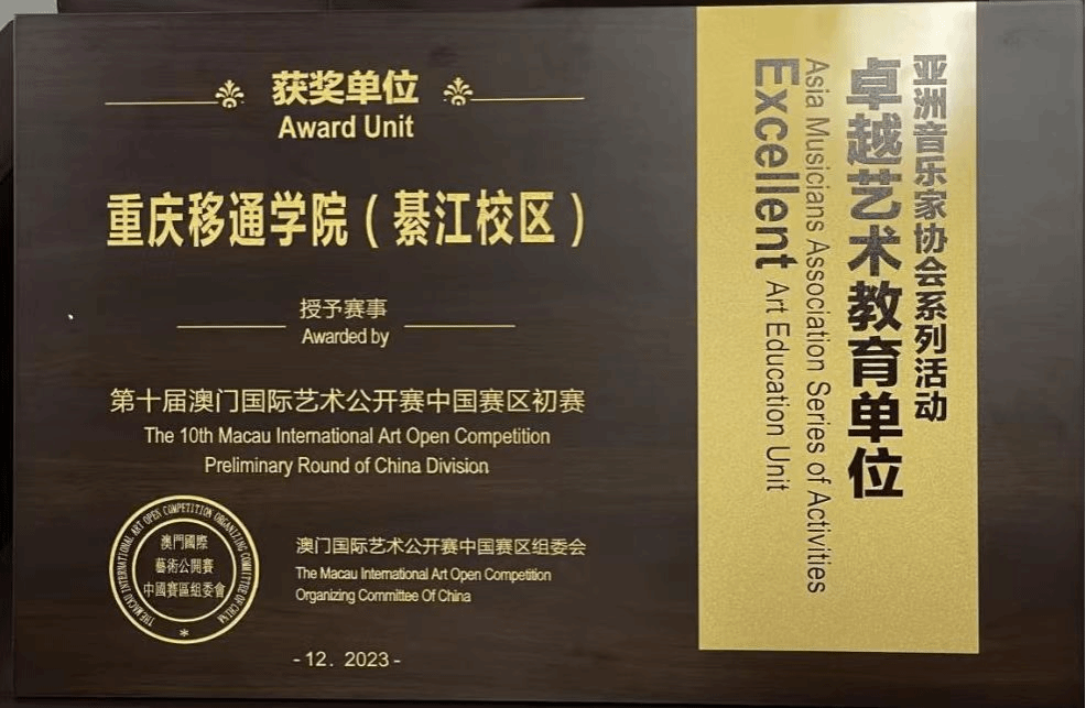 “第十届澳门国际艺术公开赛”由亚洲音乐家协会(AMA)及大湾区教育协会主办,是一个集聚亚洲各国的艺术交流舞台。本次大赛中,重庆移通学院(綦江校区)获得“卓越艺术单位”,我校5名艺术教师获“精英导师奖”。民族乐器组4金1银1铜、钢琴组1银4铜、西洋乐器组2金1银、声乐组1金5银1铜、语言表演组8金2银。其中,民族乐器组5人获得最佳人气奖。
