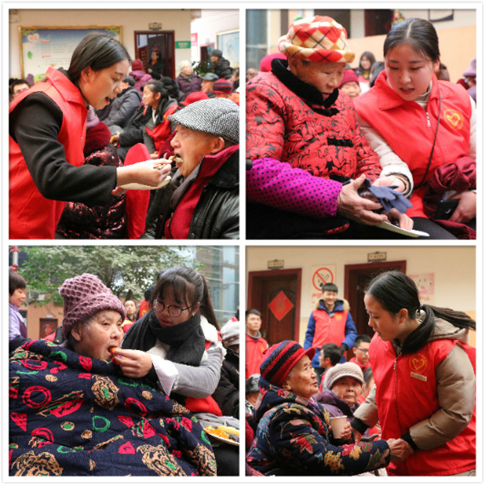 2017年下半年开始,我校引入全国性志愿服务品牌项目“青春伴夕阳”,坚持每月在康乐敬老院开展一场“青春伴夕阳”系列志愿服务活动。特别是利用“重阳节”、“冬至”、“老人生日”等时间节点,我校青年志愿者为老人们亲手烹制雪梨汤、饺子,为过生日的老人送上生日蛋糕;联合大艺团器乐分团,通过吉他、手鼓、电子琴、笛子、萨克斯等乐器,为老人们带来《外婆的澎湖湾》、《失落沙洲》、《明天会更好》等表演;精心设计有趣搞笑的有奖竞猜游戏,老人们和志愿者合作回答趣味谜语和歇后语,抢先回答正确的获得手套、围巾、帽子等温馨礼物。每一次陪伴中,老人们笑的都很开心,甚至感动的落下泪来。