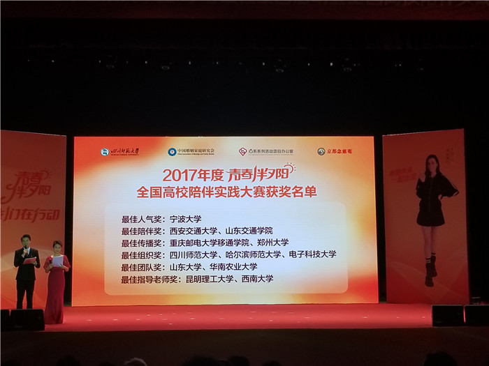 颁奖典礼上,播放了“孝心工程-青春伴夕阳”活动项目宣传片和爱心大使VCR,与会人员一同回顾了该项目的发展历程。由四川师范大学离退休处选送的教职工合唱节目《红梅赞》婉转优美,点燃了全场气氛。主持人公布了2017年度全国高校志愿者陪伴实践大赛获奖名单后,更是将气氛推向了至高点,我校志愿服务版块负责人唐彬文老师代表学校上台领取了“优秀传播奖”。